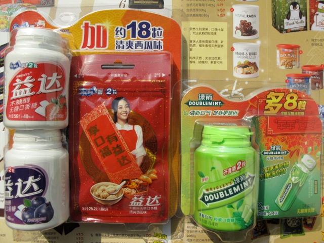Zum Start des Pferdejahres hat sich der Kaugummihersteller Wrigley’s (jianpai, 箭牌) dieses kulturelle Element zunutze gemacht. In einem speziell abgepackten Angebot mit zwei Dosen Extra (yida, 益达) in den Geschmacksrichtungen Wassermelone und Heidelbeere gibt es einen wiederverschließbaren Beutel in Gestalt eines Roten Umschlags, der 18 zusätzliche Kaugummis enthält. Hierauf sind nicht nur klassische Festtagsspeisen mit ebenso positiver kultureller Konnotation abgebildet, anstatt des Wohlstandsgottes Caishen (财神) hält eine junge Darstellerin ein Spruchband, das dem Käufer „Glück im Mund“ verspricht (xiang kou fu you yida, 享口福有益达). Eine Sonderverpackung für die Marke Doublemint wiederum enthält 8 zusätzliche Kaugummis. Nicht ohne Zufall in der Geschmacksrichtung Apfel, schließlich ist die erste Silbe des Wortes Apfel (pingguo, 苹果) homophon zu der ersten Silbe aus „ping an“ (平安). Dieses steht für friedlich, gesund oder sicher. „’苹苹’安安“ heißt es folglich auf der Verpackung.