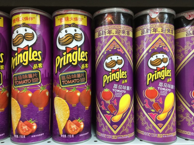 Das chinesische Neujahrfest liegt bereits Wochen zurück, doch einige Sonderaufmachungen sind noch auf den Supermarktregalen anzutreffen, die an die festliche Saison erinnern. Darunter zwei Stangen Pringles-Chips (品客, pinke) in der Geschmacksrichtung Tomate, die zum Jahreswechsel ein Design mit chinesischen Elementen erhielten. Auf der einen Verpackung ist im Hintergrund die Shanghaier Hochhaussilhouette von Pudong mit dem Orientalischen Perlenturm zu erspähen. Und davor Hybride in Rot: Eine Kombination aus Tomaten und traditionellen chinesischen Lampions. In China werden letztere besonders zu Feiertagen als Glücksbringer aufgehängt. Auf einer gelben Plakette direkt über dem Markenmaskottchen „Julius Pringles“ verspricht die amerikanische Marke, die in den 1960ern entwickelt wurde und dessen Name auf die Straße Pringle Drive in Cincinnati zurückführt, eine Explosion an Wohlgeschmack (美味大爆炸, meiwei da baozha).