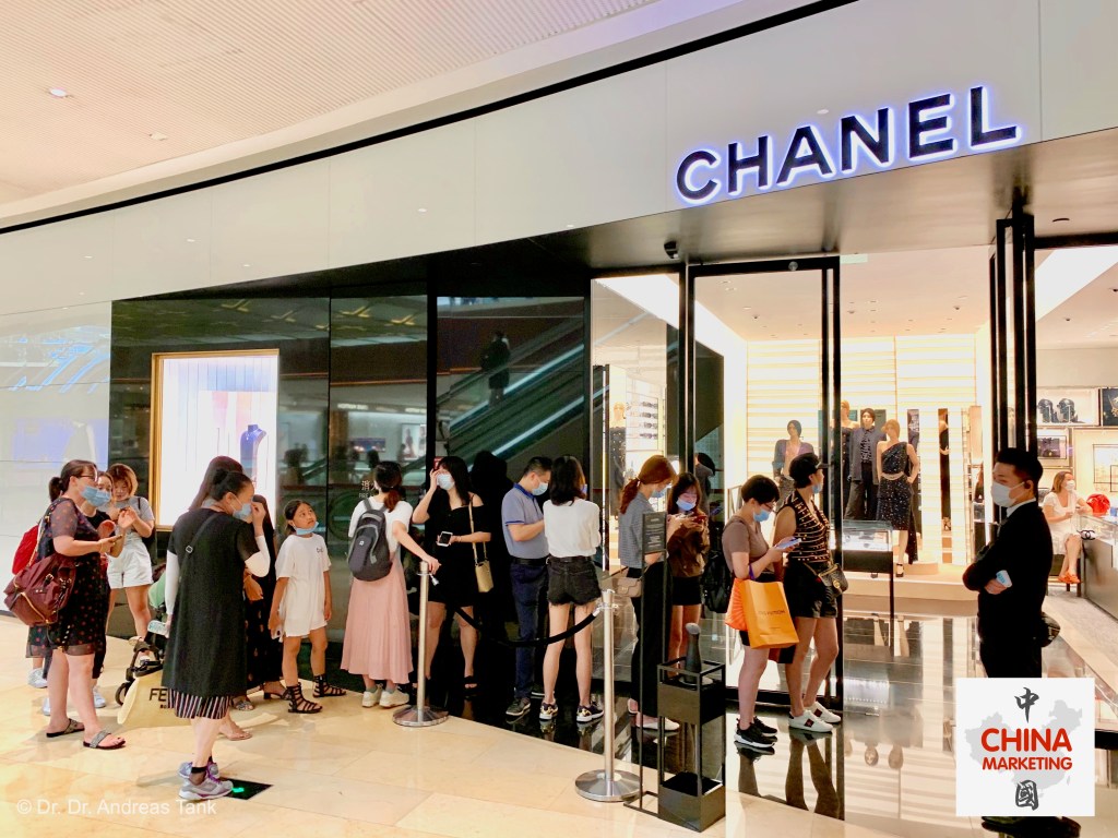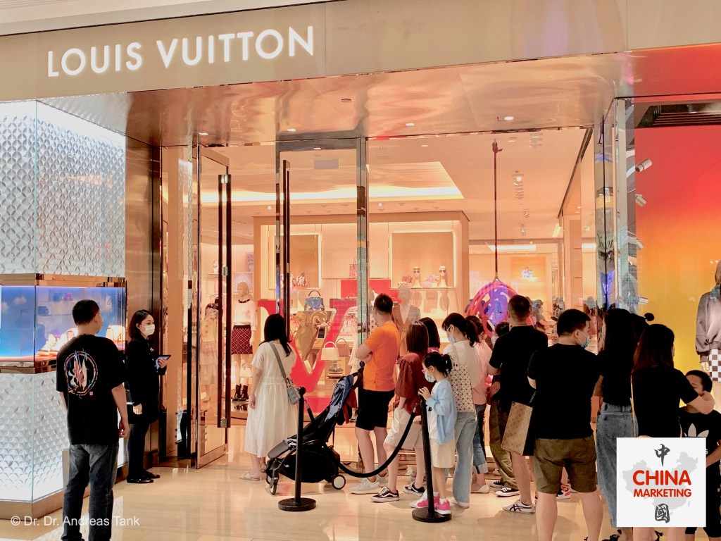 Bestandsaufnahme in der Premium-Einkaufsmall Taikoo Hui in der südchinesischen Wirtschaftsmetropole Guangzhou. Gesamteindruck wie zu Zeiten vor dem Ausbruch von Covid-19: Konsumentenmassen, wohin die Augen blicken, und permanent Warteschlangen vor den Flaggschiffgeschäften von Luxusmarken wie Cartier, Chanel, Gucci, Hermès oder Louis Vuitton. Der Renminbi rollt wieder. at