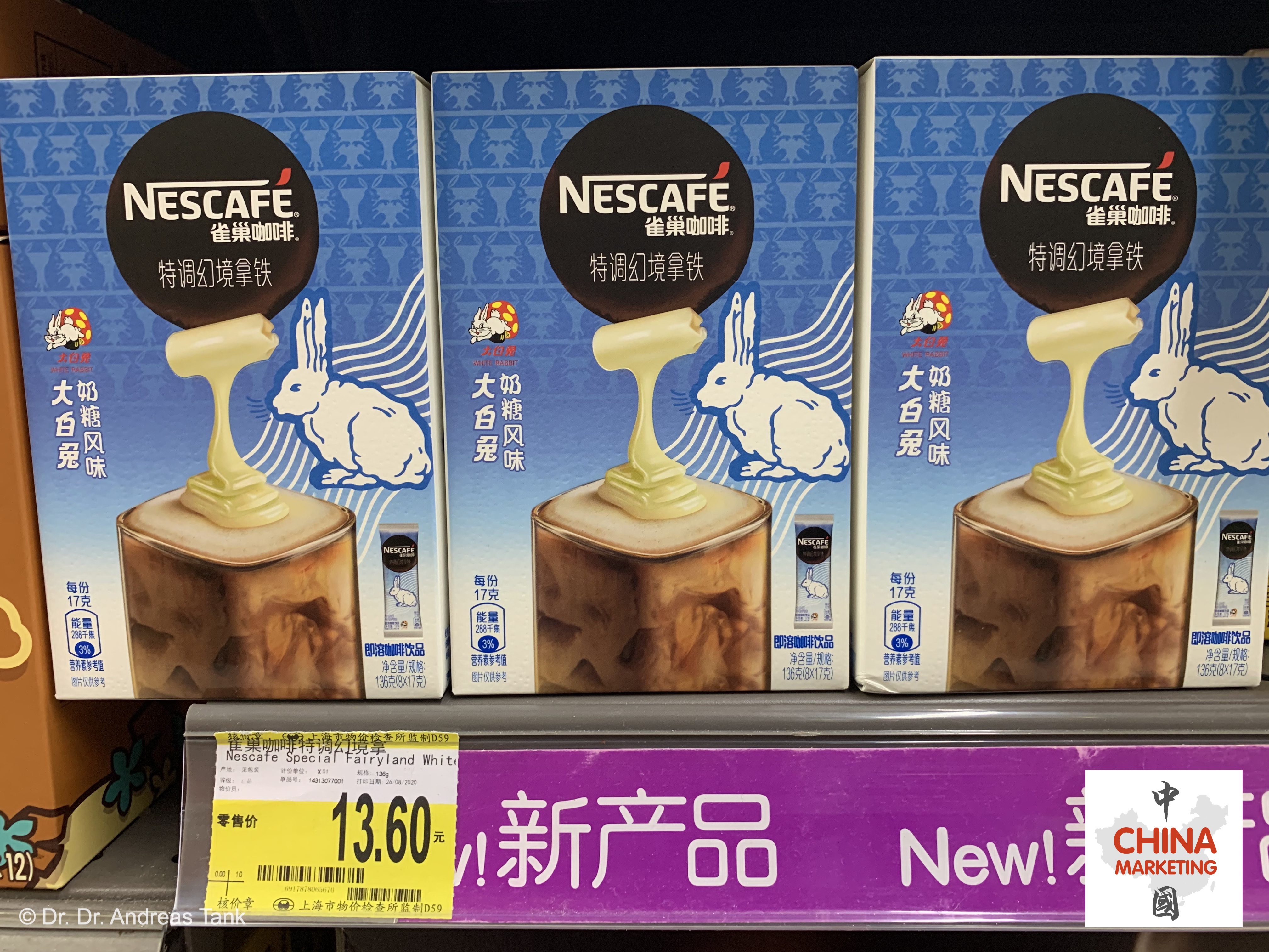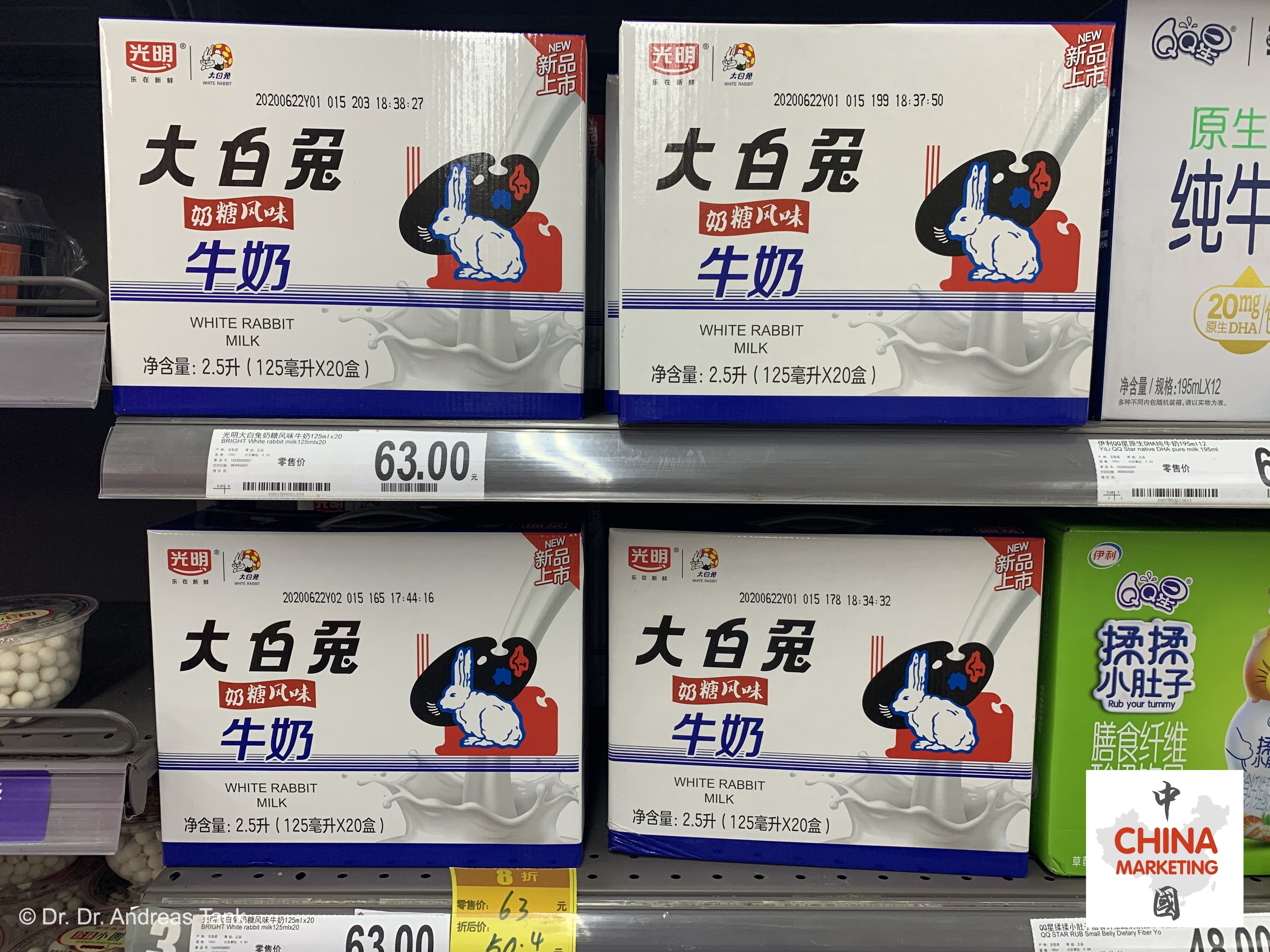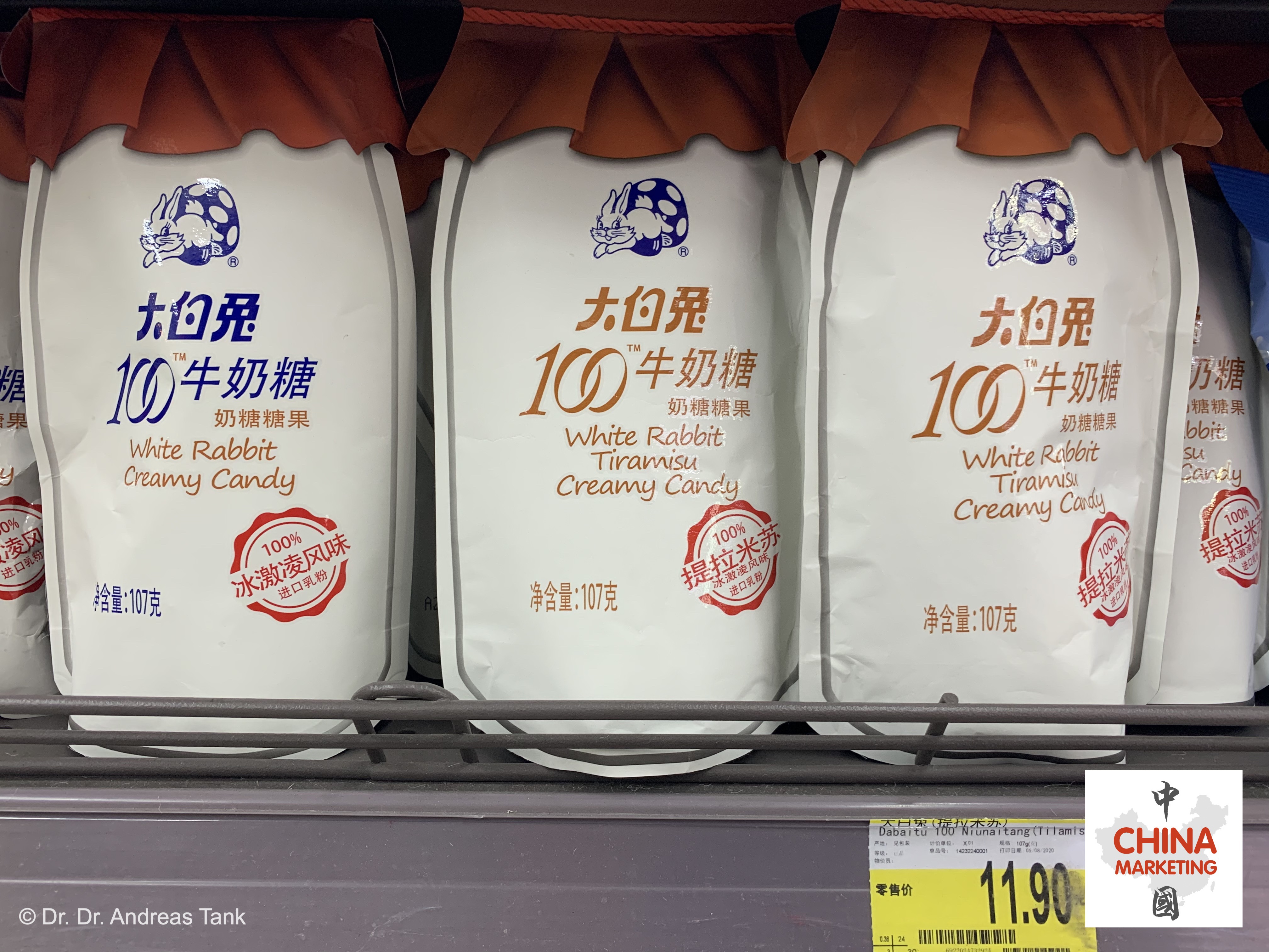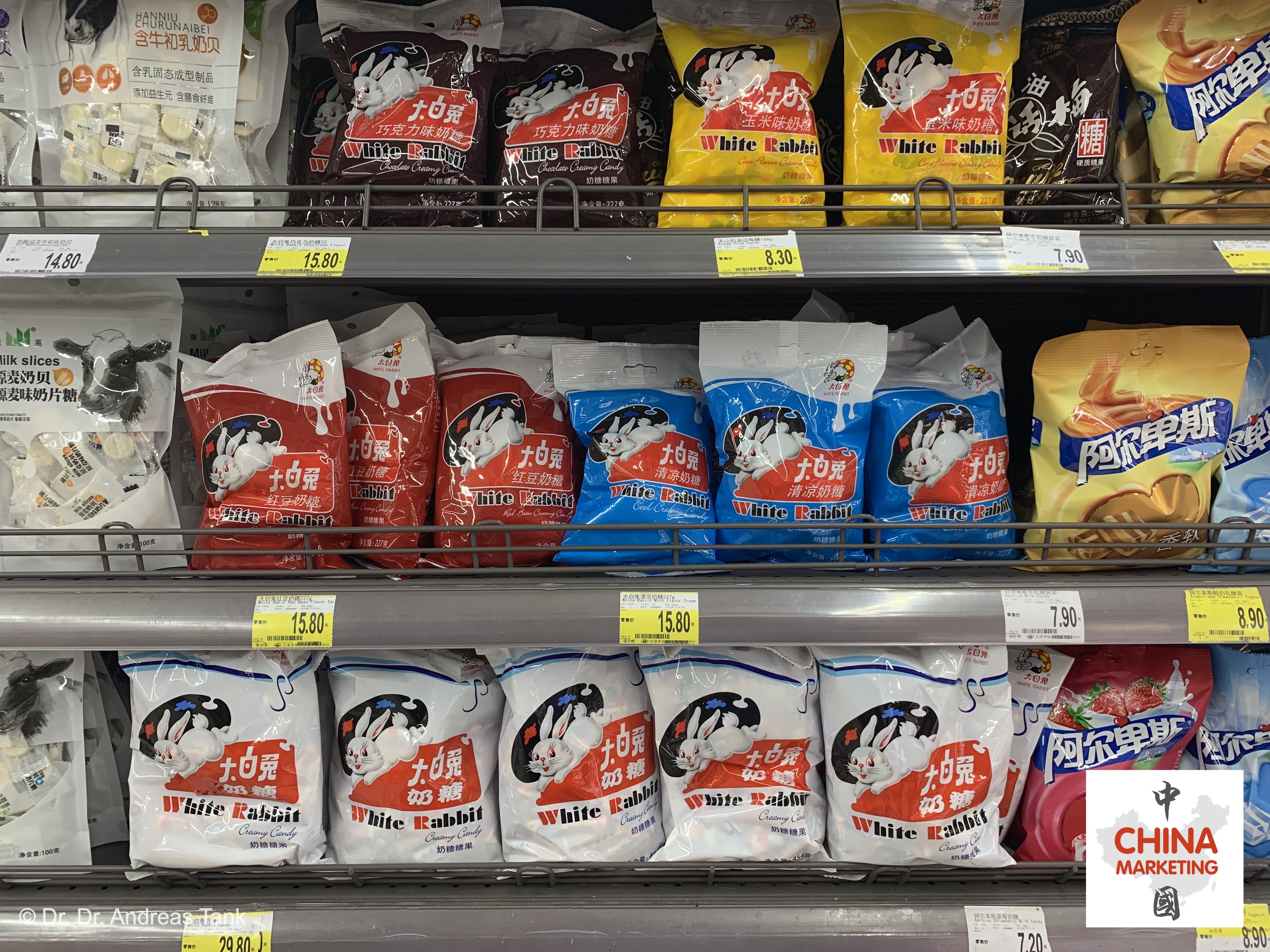 Carrefour Store Check in Shanghai: Es ist äußerst bemerkenswert, wie die ikonische chinesische Milchbonbonmarke White Rabbit in den letzten Jahren immer mehr Kontaktpunkte im Supermarkt geschaffen und gleichzeitig die Marke verjüngt hat. Neben einer ständig wachsenden Auswahl an Geschmacksrichtungen und Verpackungsarten im Süßwarenregal können Verbraucher aktuell auch White Rabbit-Eiskrem und White Rabbit-Milch genießen; beide produziert vom chinesischen Milchgiganten Guangming. Oder sie trinken einen White Rabbit-Kaffee von Nescafé. Vor nicht allzu langer Zeit noch etwas „in die Jahre gekommen“, spricht White Rabbit heute auch jüngere Zielgruppen an und ist wieder voll auf Kurs. at