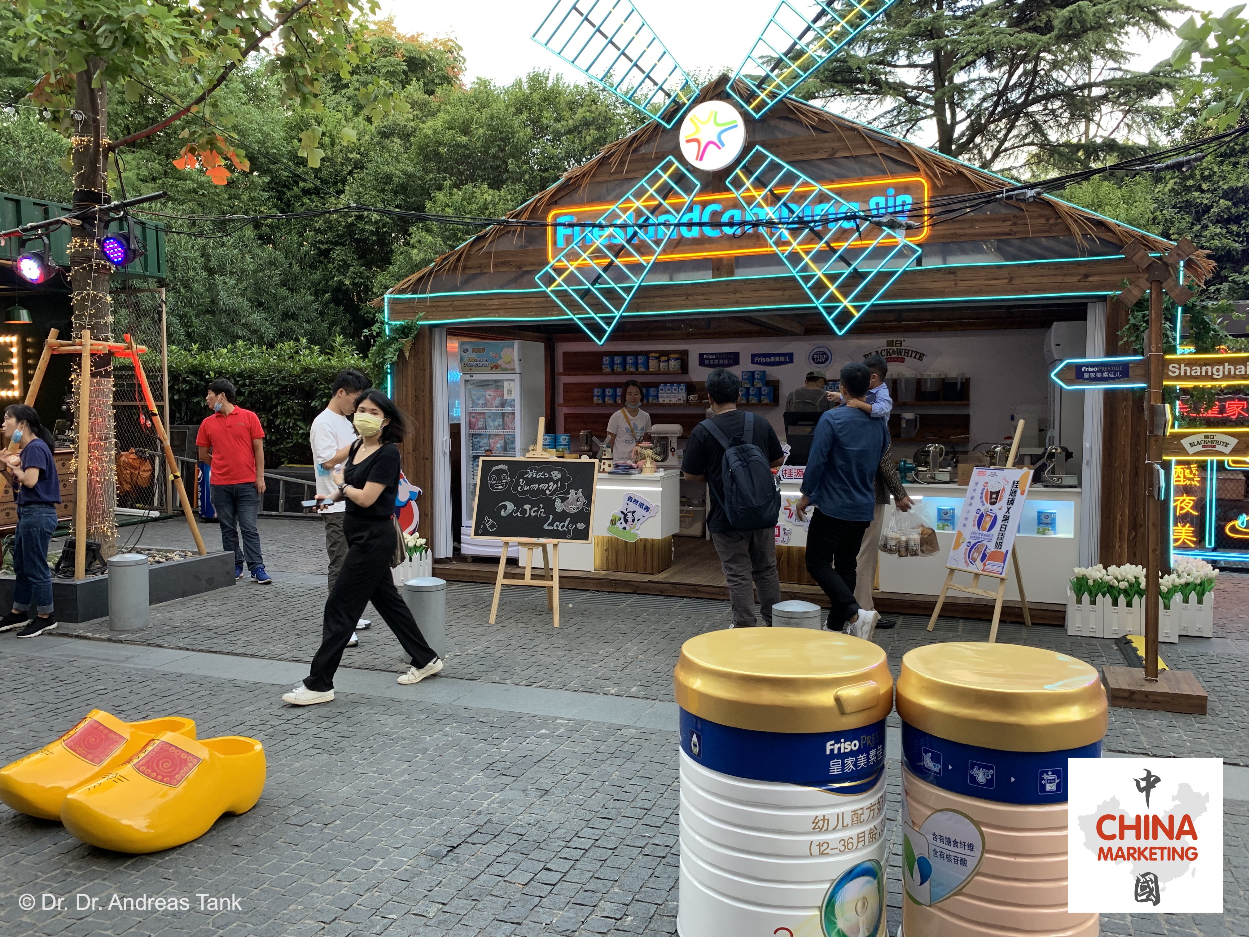Nachtmärkte haben in Shanghai in diesem Jahr ein Comeback erlebt. Das Wiederaufleben ist ursprünglich auf eine vorsichtige staatliche Förderung des Straßenhandels zurückzuführen, um zum einen den Konsum anzukurbeln und zum anderen durch COVID-19 verursachte Arbeitslosigkeit zu bekämpfen. Wenige Monate später sind diese Märkte im Grunde zu einer Institution in der ganzen Stadt geworden. Nicht wenige ziehen an den Wochenenden zehntausende Besucher an. Dieses bietet Marken eine großartige Gelegenheit, mit Verbrauchern in Kontakt zu treten. FrieslandCampina hatte kürzlich einen Stand auf dem Waitanyuan Night Carnival, um für seine Marken Black & White, Dutch Lady, Frisco und Debic zu werben und neue Produkte vorzustellen. Der niederländische Ursprung wurde unverkennbar durch Windmühlen und Clogs vermittelt. Mitten in Shanghai hieß es: Welkom in Nederland! at