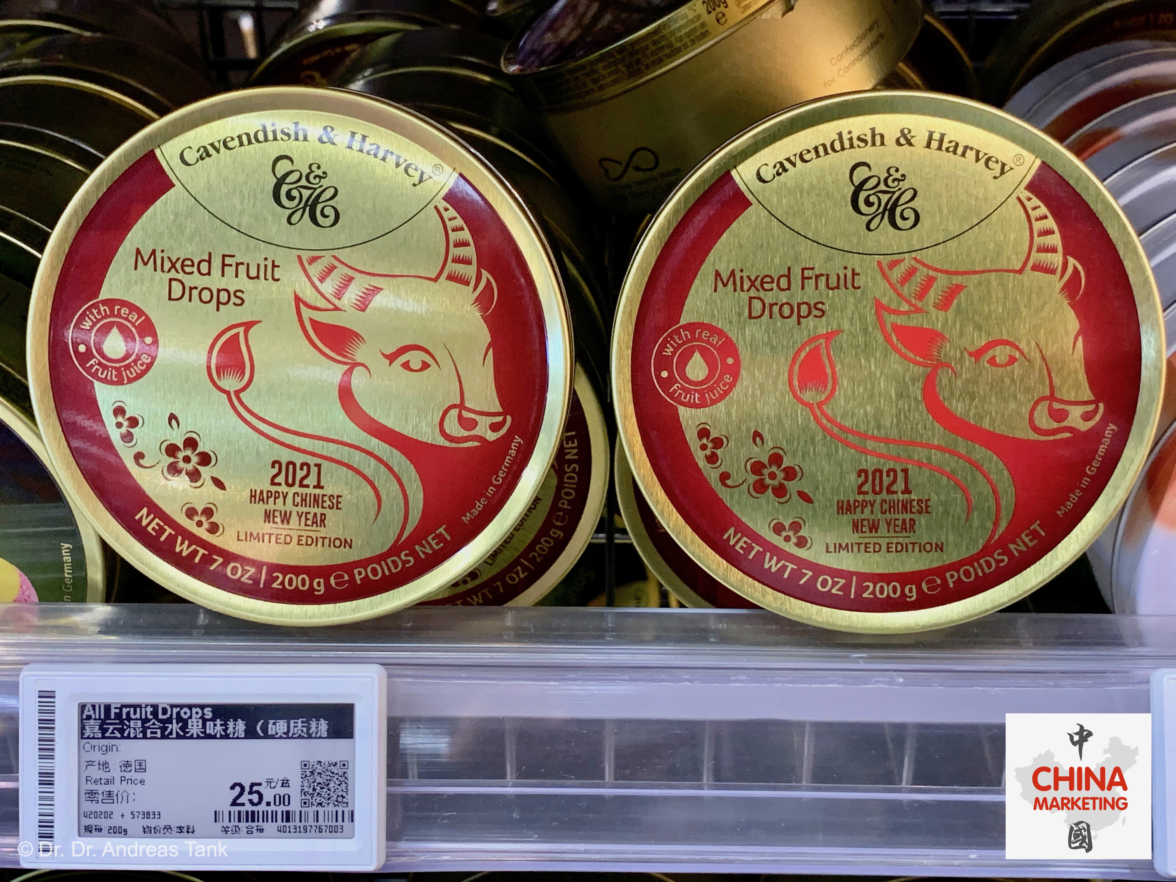 Die deutsche Süßwarenmarke Cavendish & Harvey erfreut sich in China bereits seit vielen Jahren großer Beliebtheit. In Premium-Supermärkten im ganzen Land und auch über Online-Kanäle distribuiert, dominieren die ikonischen goldenen Dosen die Bonbonregale. Zum ersten Mal in seiner 88-jährigen Geschichte, und brandneu in China im Regal, hat Cavendish & Harvey eine limitierte „Happy Chinese New Year“-Ausgabe für das Jahr des Ochsen 2021 entworfen. Ideal für Familientreffen und auch Frühlingsfestreisen. Die bunte Früchtemischung bietet für jeden Geschmack etwas und eignet sich daher perfekt zum Teilen unter Süßwarenkennern: Confectionary for Connoisseurs. at