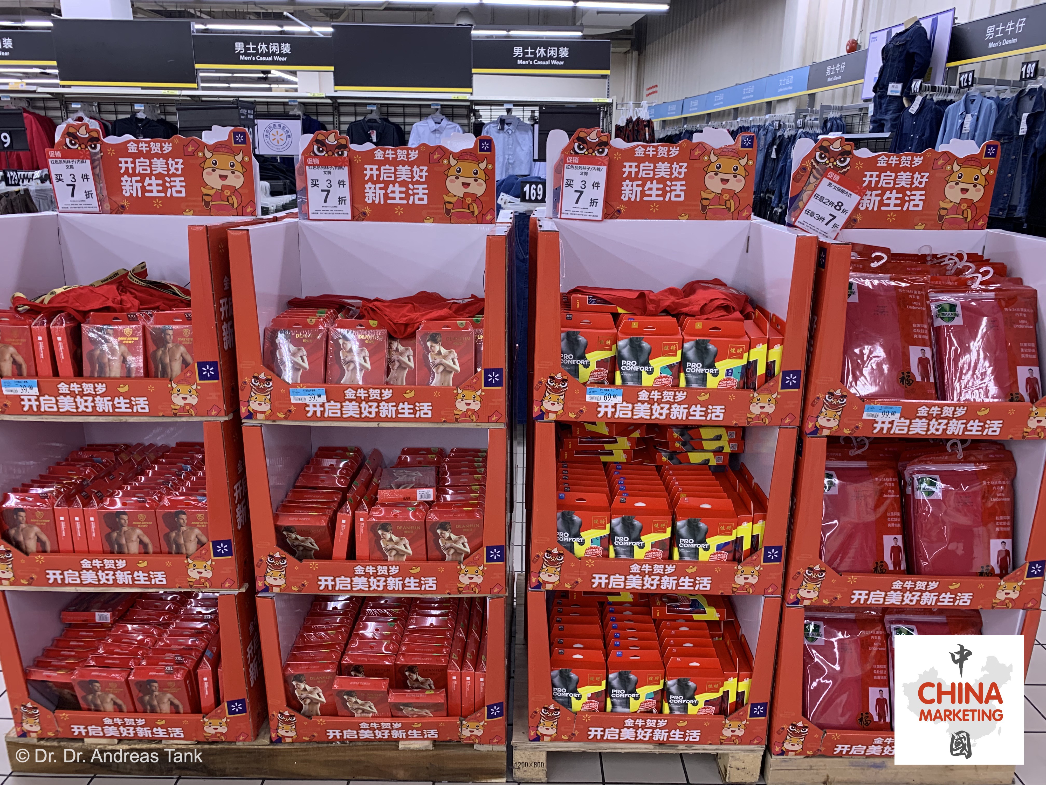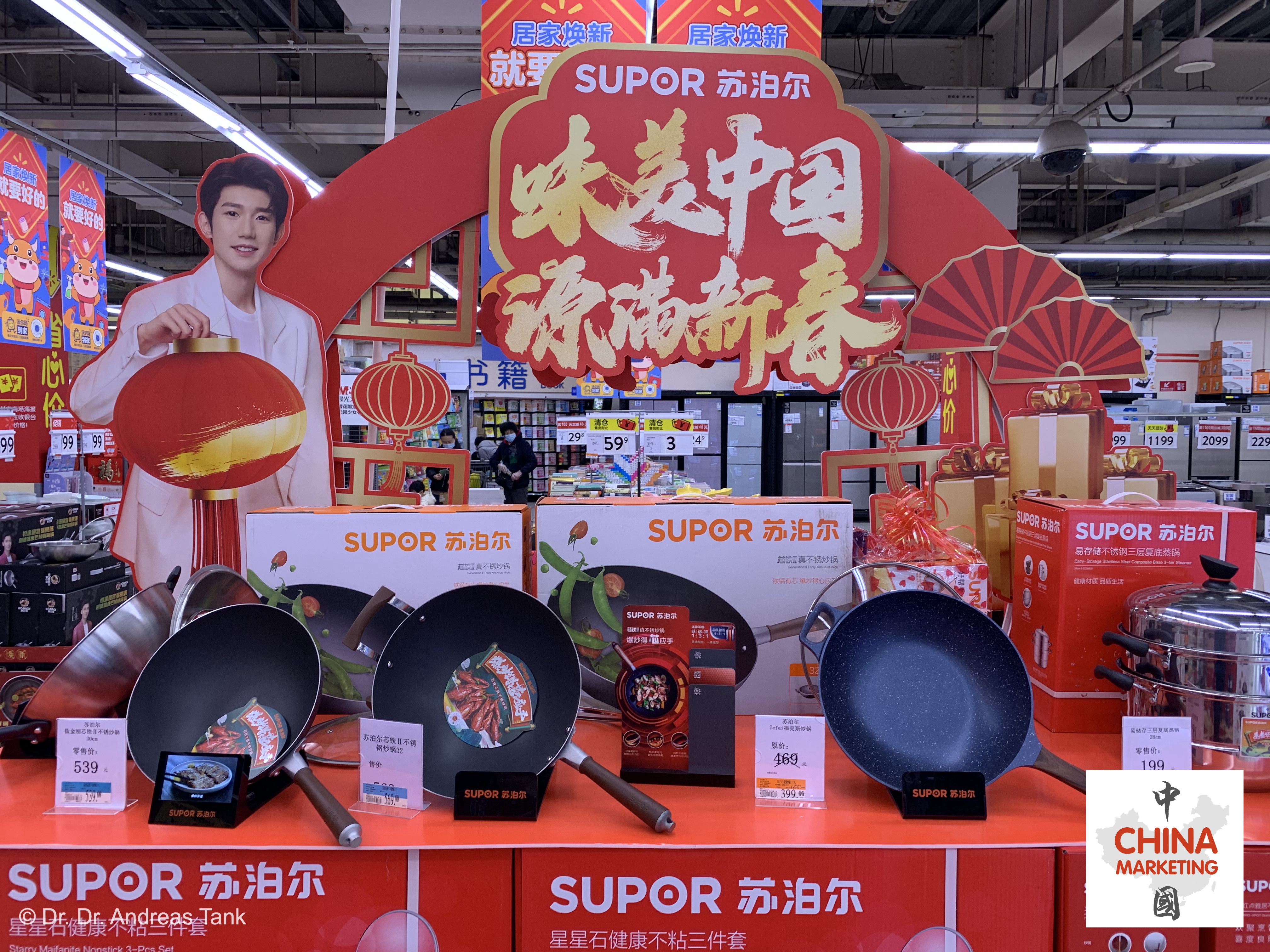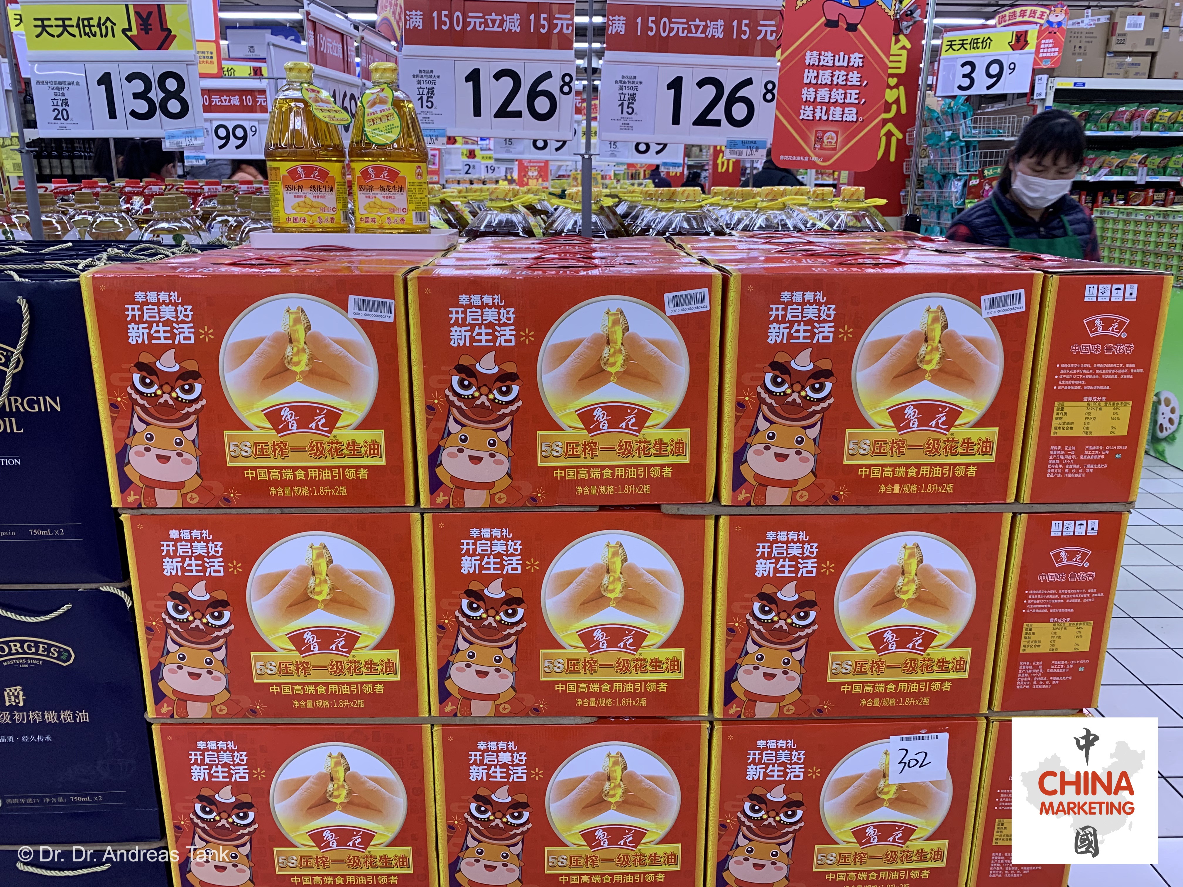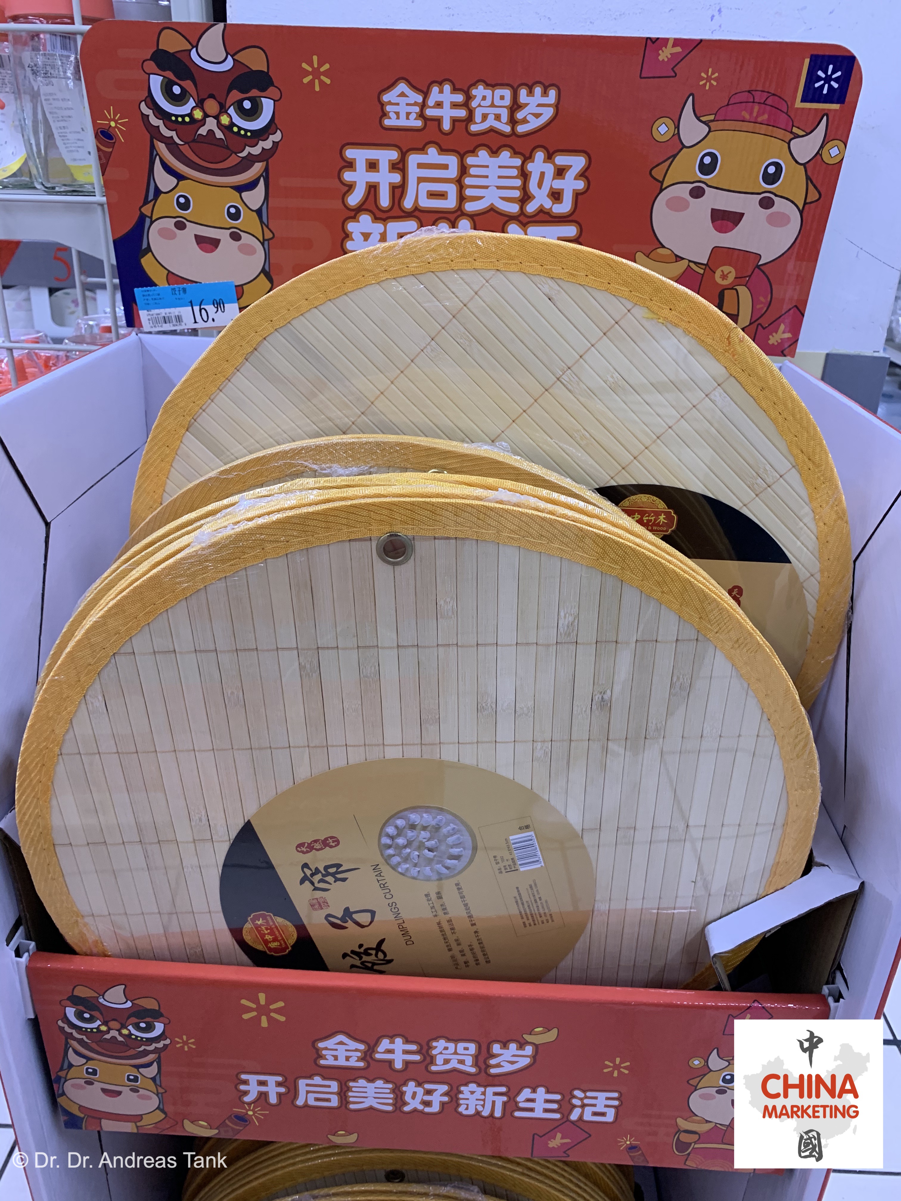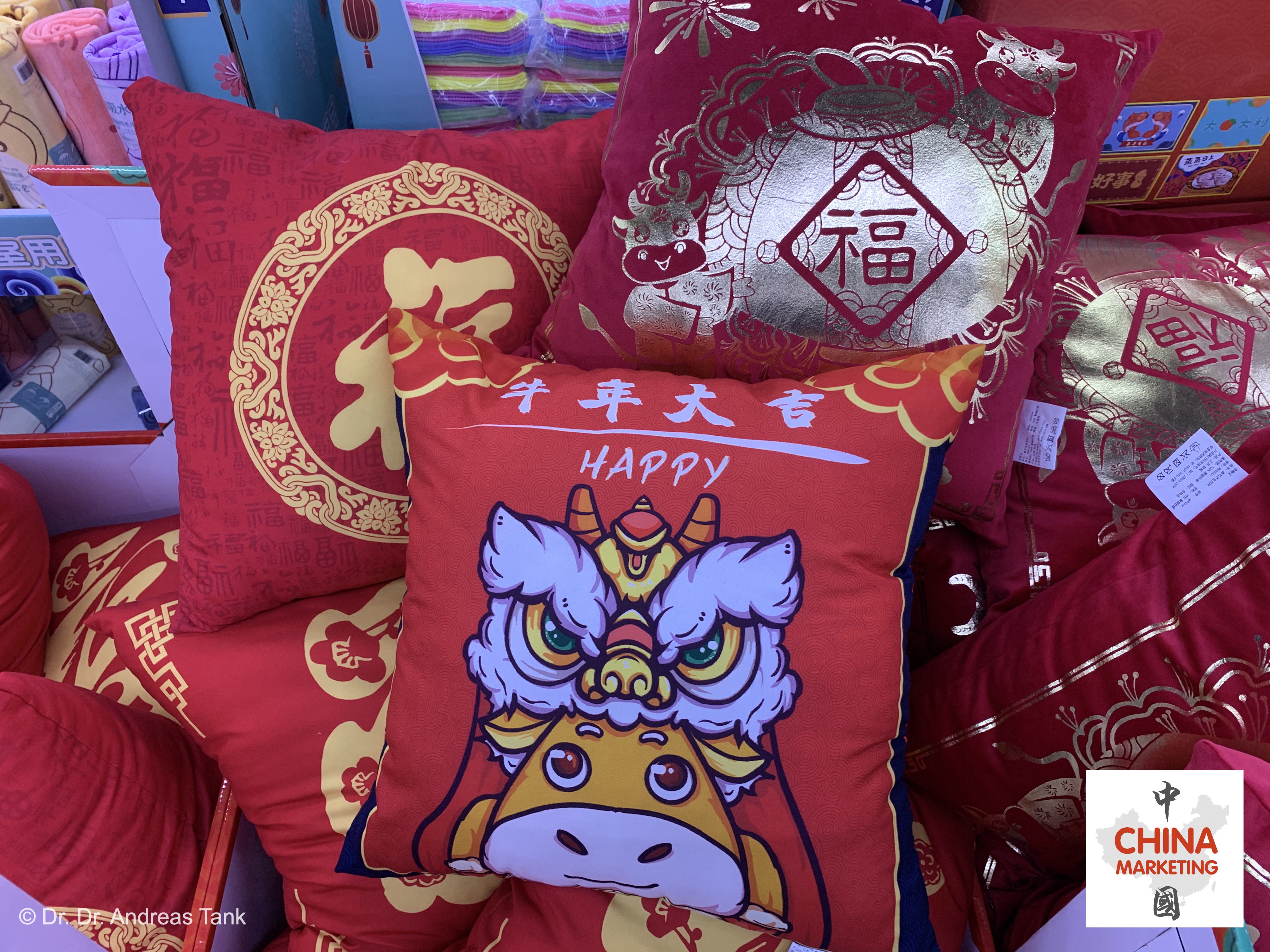 Supermarktbesuche vor dem chinesischen Neujahrsfest sind immer etwas Besonderes: Freudige Musik, eine Fülle an farbenfroher Frühlingsfestdekoration, attraktive Geschenkverpackungen und ein umfangreiches Angebot, um sich optimal auf die Feiertage vorzubereiten. Darunter beispielsweise ein rot-goldener Fußabtreter mit den Schriftzeichen „出入平安“ – frei übersetzt „wohlbehalten ausgehen und heimkehren“ –, Nackenkissen für die lange Heimreise (春运) mit niedlichen Designelementen des Jahrestiers, ein neuer Wok und Bambusmatten für die Herstellung von traditionell zum Neujahrsfest konsumierten halbmondförmigen Jiaozi-Teigtaschen, Snackdosen, rote Sofakissen mit glücksverheißenden Schriftzeichen, obligatorische rote Unterwäsche, Speiseöl und Reis in Großpackungen… praktisch unmöglich, sich nicht von der festlichen Stimmung anstecken zu lassen. at