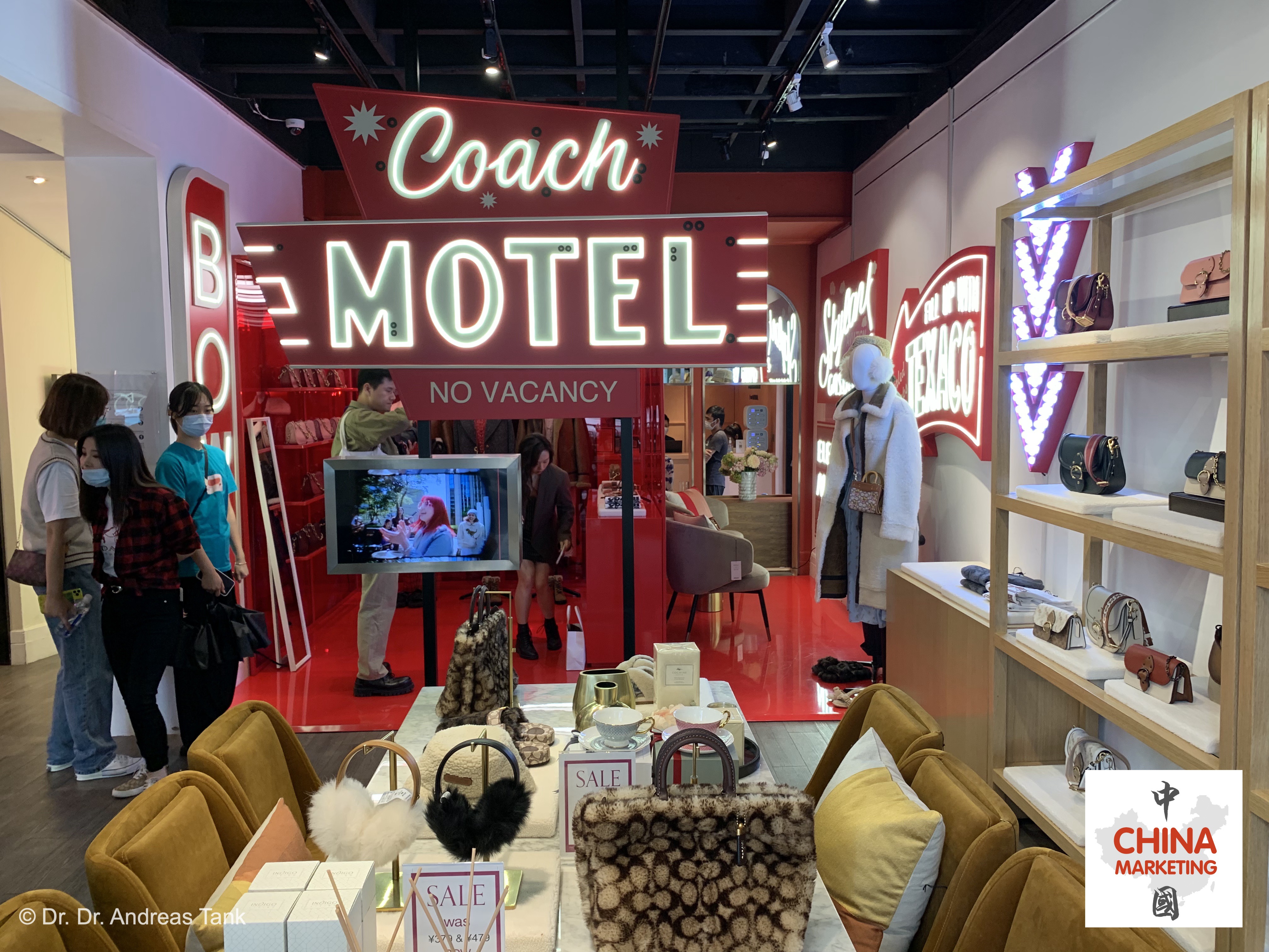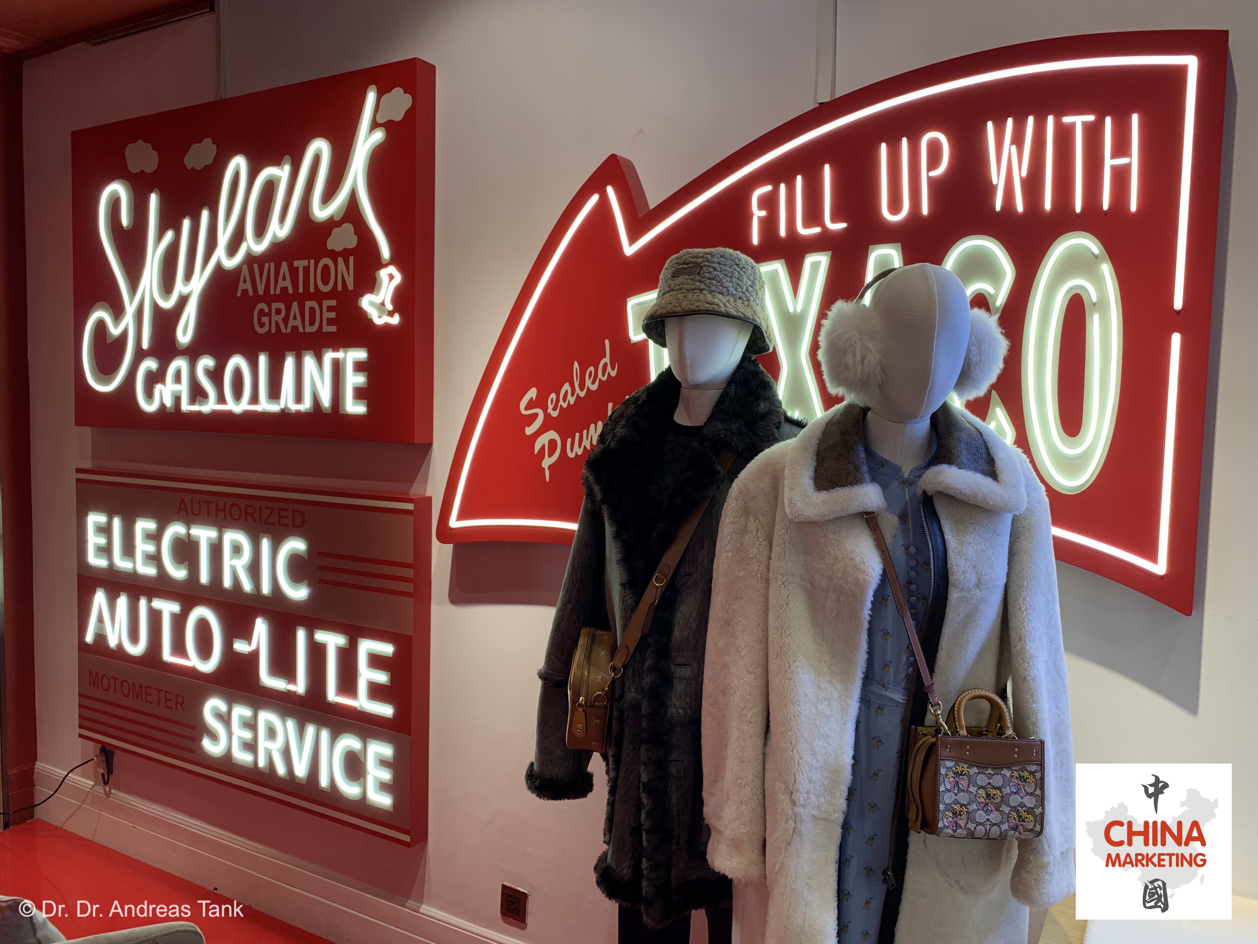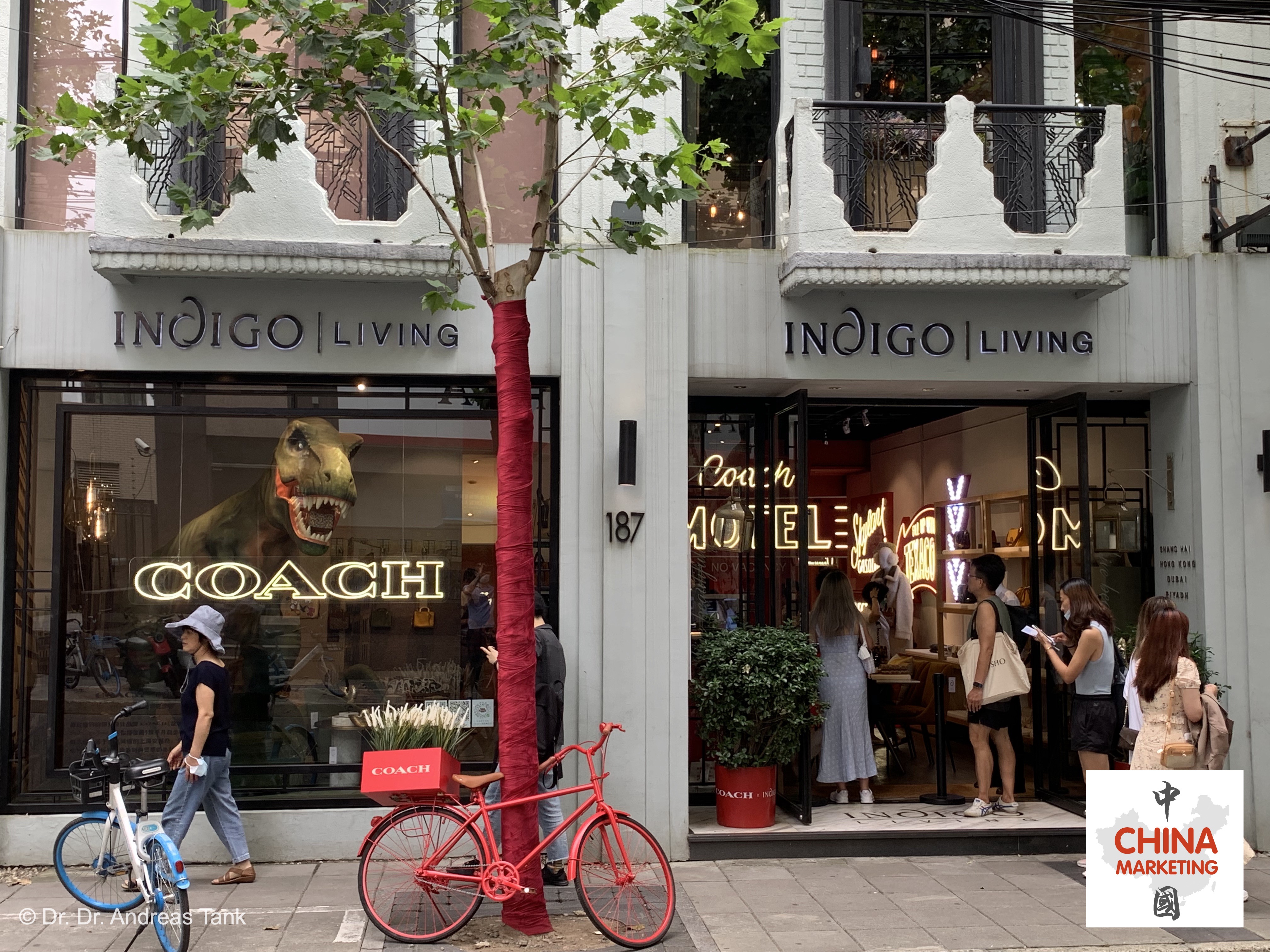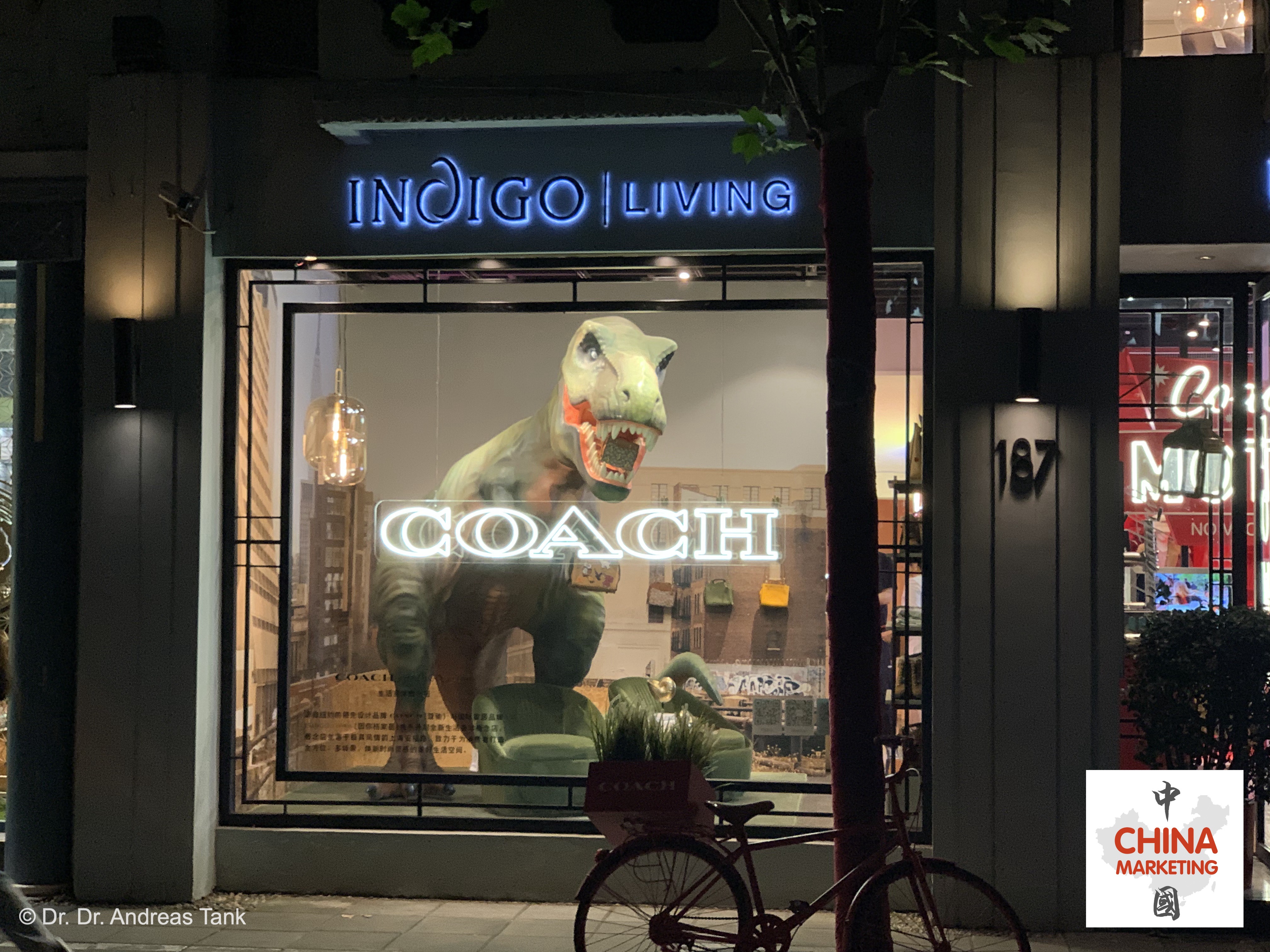 Während der Goldenen Woche kooperierte die amerikanische Luxusmarke Coach mit dem gehobenen Einrichtungshaus Indigo Living und eröffnete in deren Geschäft in der pulsierenden Anfu Road inmitten der ehemaligen französischen Konzession in Shanghai auf allen Etagen Pop-Up-Flächen. Die Anfu Road zog während der Feiertage eine große Anzahl von Besuchern an und der neu dekorierte Laden wurde zu einem der Besuchermagneten. Kaum jemand, der ohne Foto an dem Dinosaurier-Schaufenster vorbeiging. at