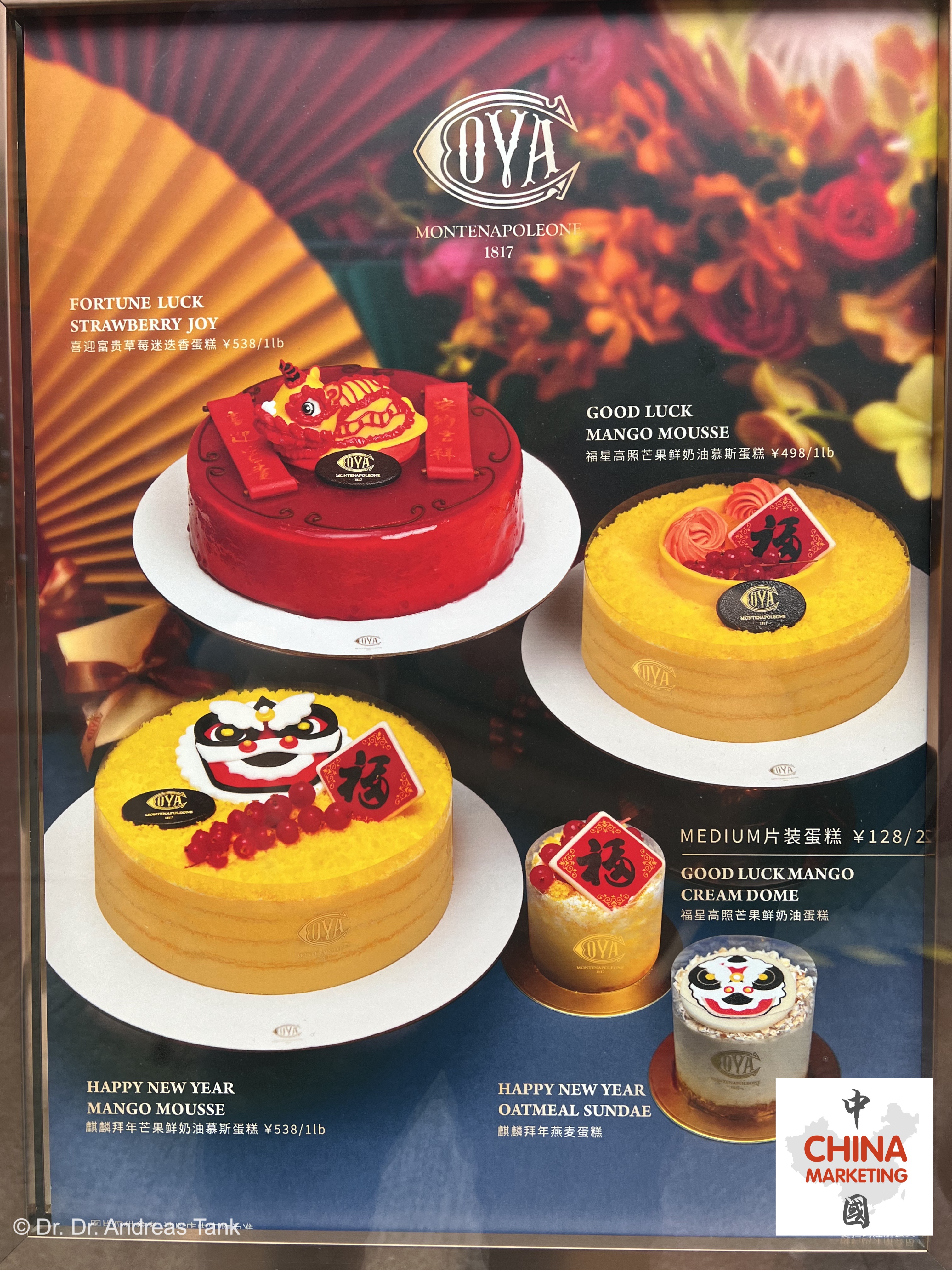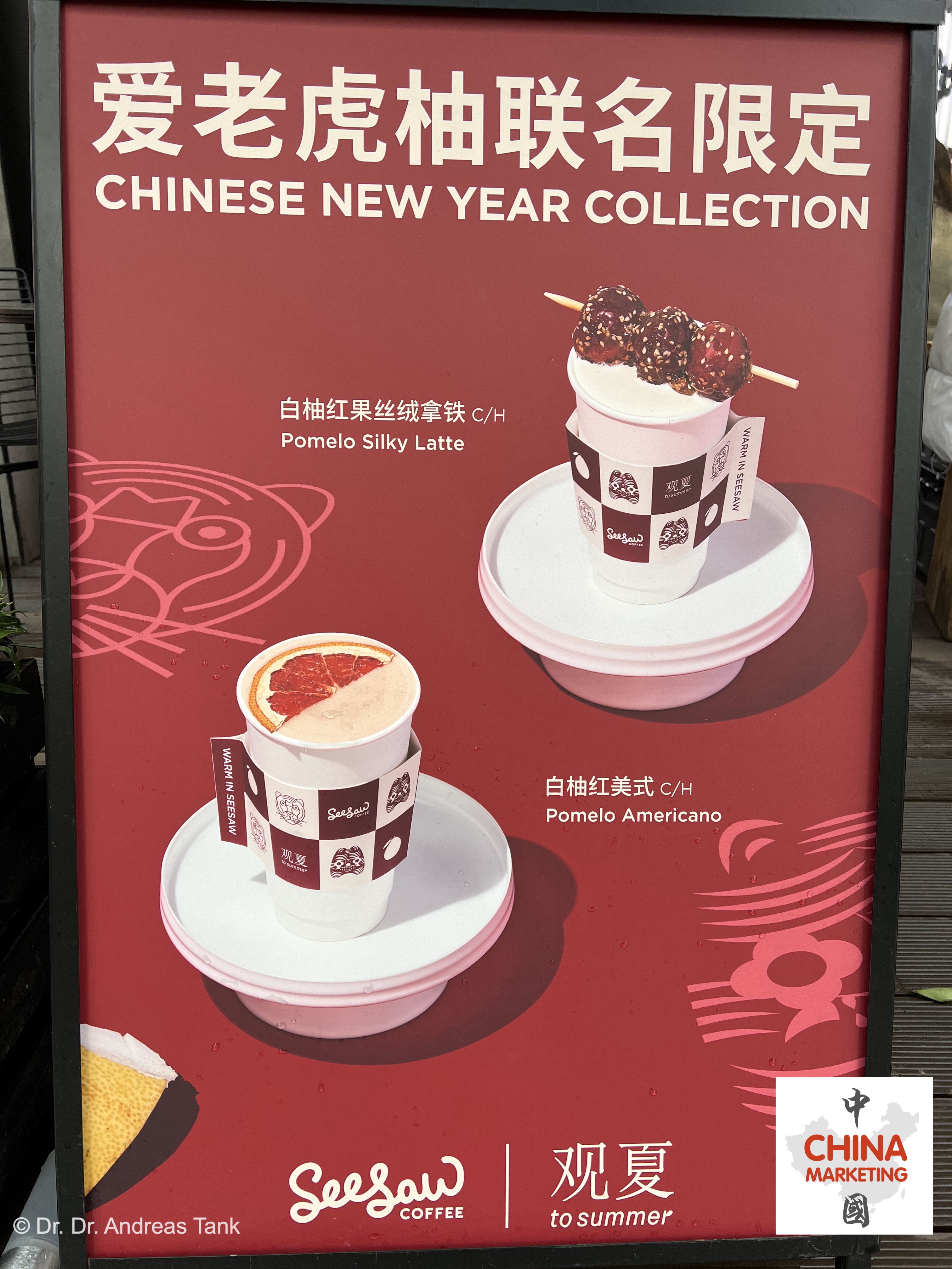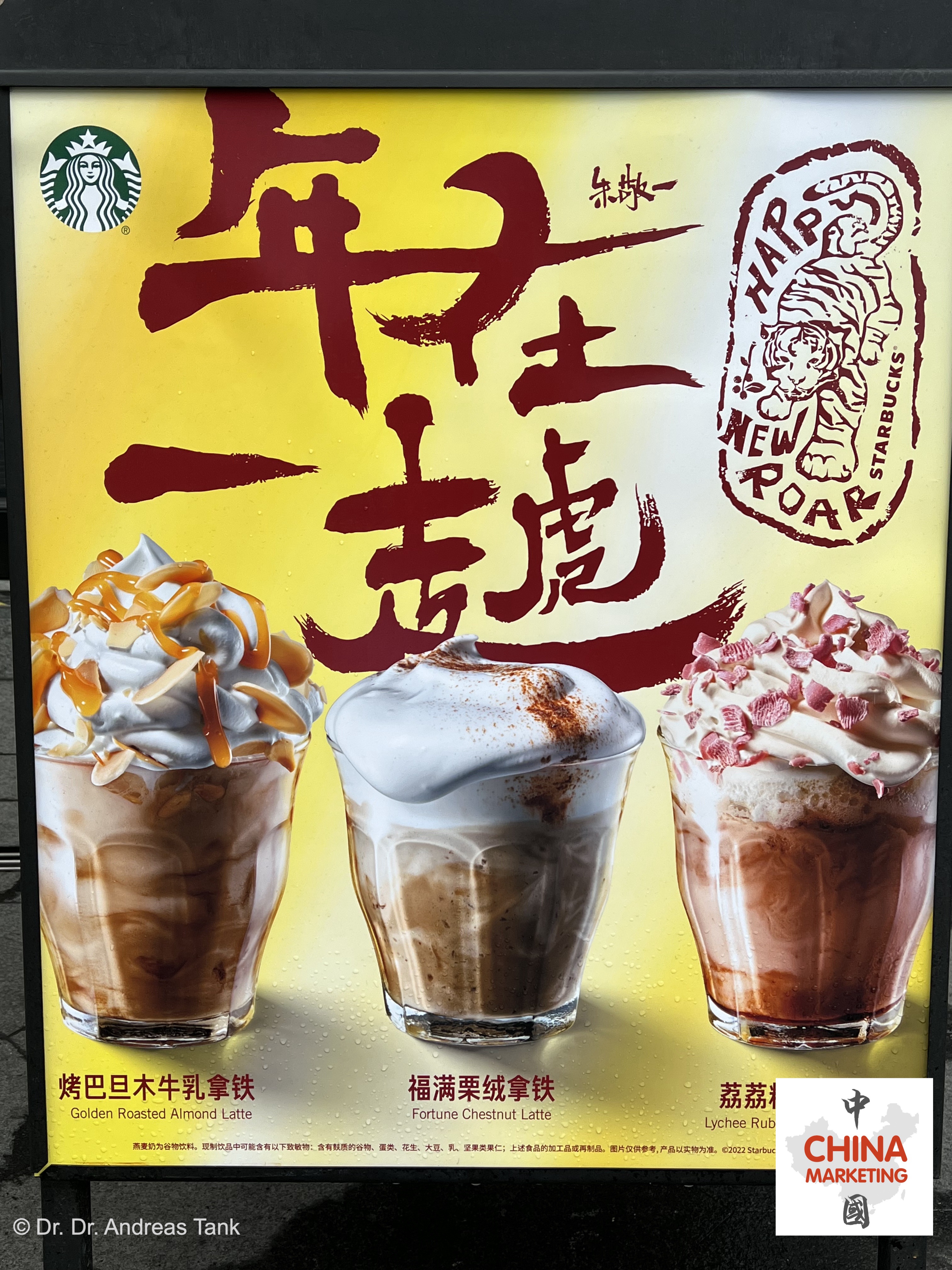 Während der Frühlingsfestsaison bringen Kaffee- und Bäckereiketten stets besondere Geschmacksrichtungen und Kuchendesigns auf den Markt. Zum Jahr des Tigers können Konsumenten beispielsweise bei Costa „Tigerklauen“-Kuchen, bei Cova „Viel Glück Mango Mousse“-Kuchen oder bei Starbucks „Gutes Schicksal Kastanien Latte“ genießen. Costa hat ebenso einen Latte mit Kastaniengeschmack. Warum Kastanie? Wird das Zeichen „利“ (li) aus dem beliebten Neujahrsgruß „大吉大利“ (da ji da li) durch das homophone Schriftzeichen „栗“ für Kastanie (栗子, lizi) ersetzt, ergibt dieses die Frühlingsfestserie „大吉大栗“. at