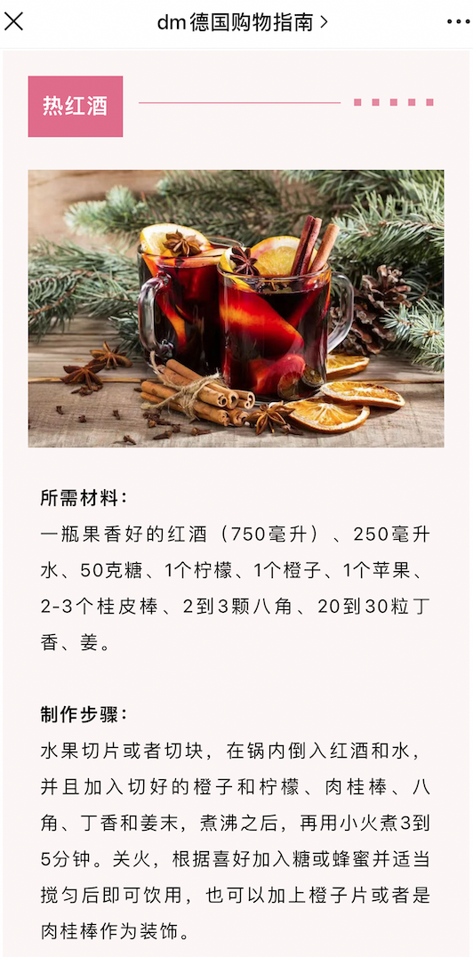 Glühwein scheint in diesem Winter ein wortwörtlich heißer Trend in Shanghai zu sein. Costa Coffee bietet einen mit Orange und Glühwein aromatisierten Latte auf Hafermilchbasis und einen Orange-Glühwein-Americano an, zahlreiche Bars und Cafés verkaufen Glühwein und haben sogar kleine Stände aufgebaut, die deutsche Drogeriemarktkette dm teilte ein Glühweinrezept auf ihrer WeChat-Plattform, und das Shanghaier Luxushotel Waldorf Astoria wirbt mit einem „Himmlischen Schokolade-Glühwein-Mousse-Kuchen“. Eine vielfältige Auswahl für jeden Geschmack und Geldbeutel. at