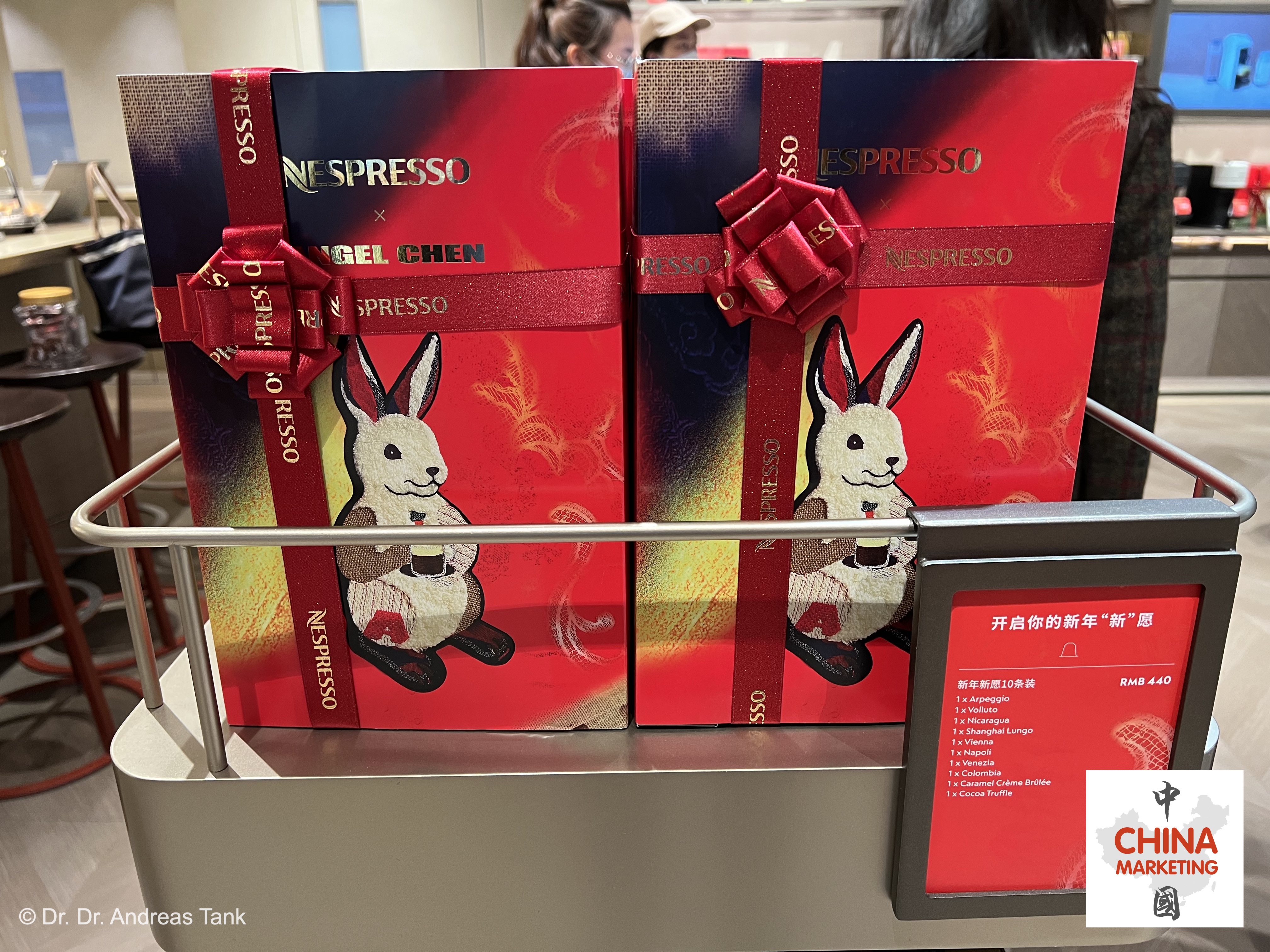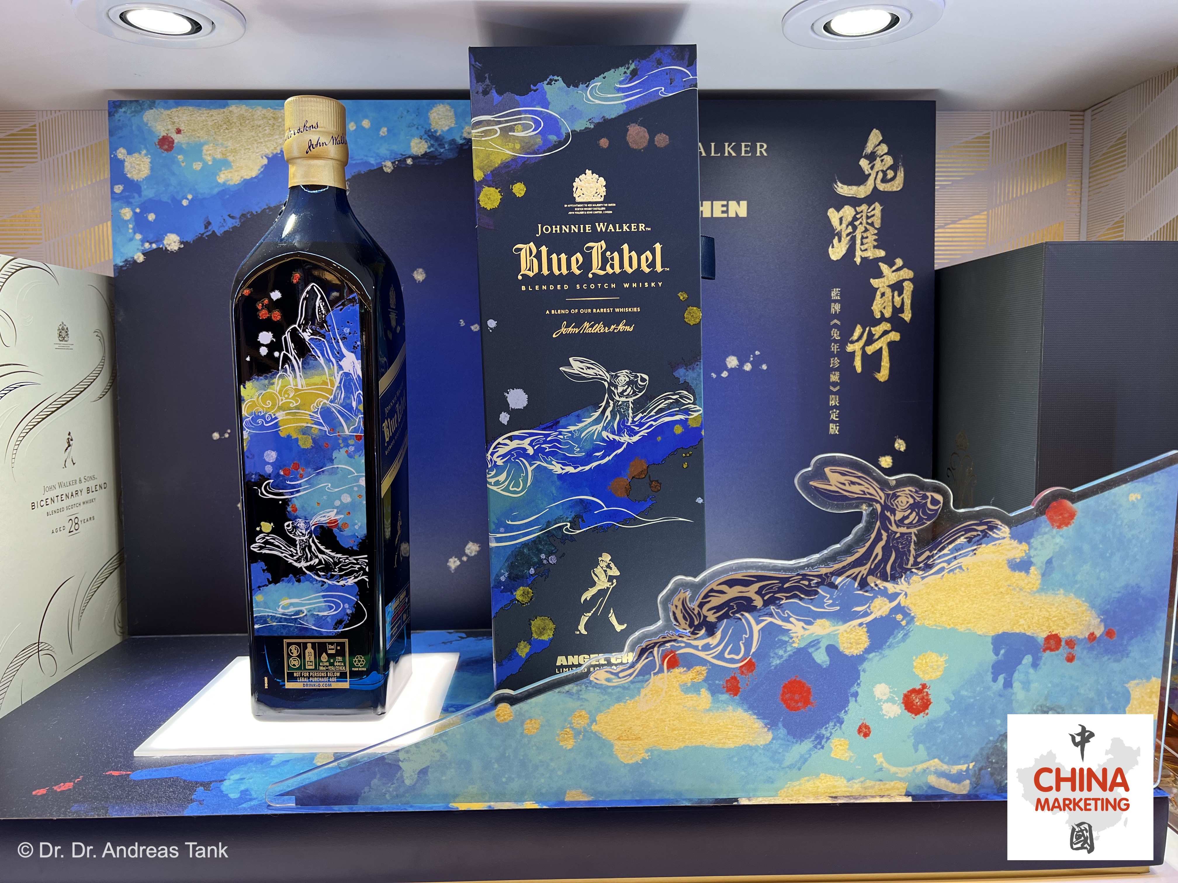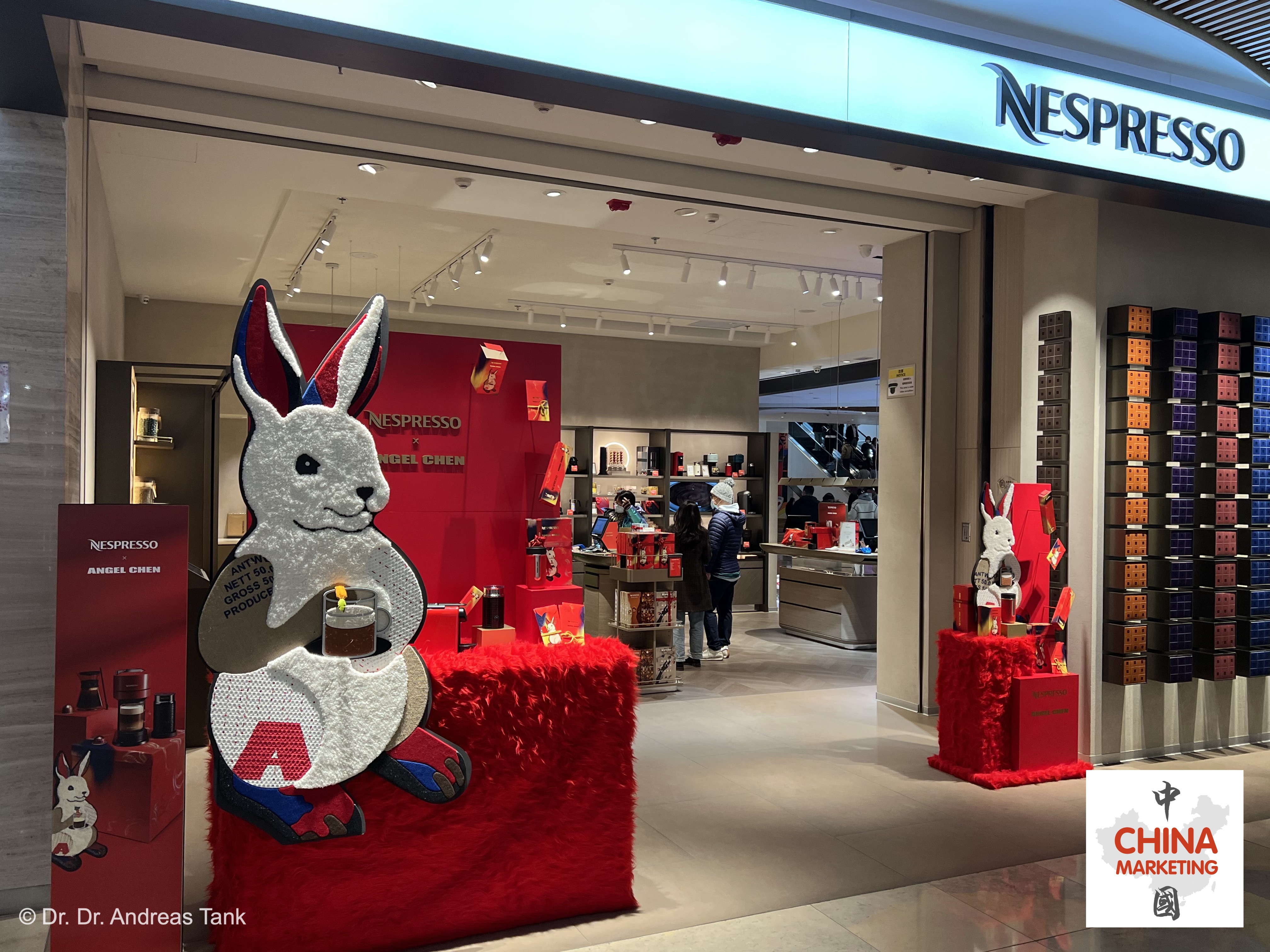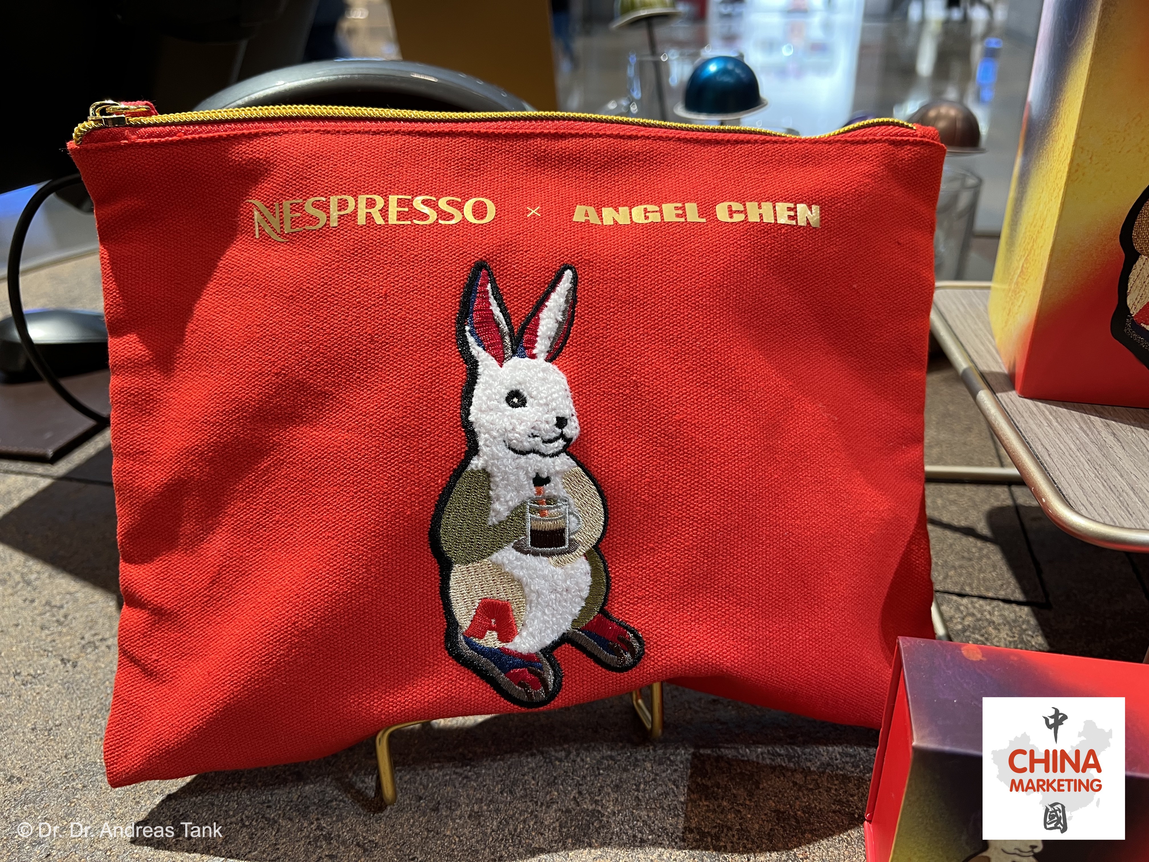 Die gefeierte chinesische Designerin Angel Chen wurde sowohl von Nespresso als auch von Johnnie Walker engagiert, um deren Sondereditionen zum Jahr des Hasen zu entwerfen. Chens Muster und Upcycling-Stofftexturen wurden in das saisonale Nespresso-Portfolio integriert, darunter eine Geschenkpackung für Kaffeemaschinen, Thermosbecher, Essstäbchen, Kaffeekapselsets und rote Geldumschläge (hongbao, 红包). Für die Johnnie Walker Frühlingsfestedition schuf die in Shanghai lebende Chen eine Illustration eines tänzelnden Hasen, der durch eine Berglandschaft springt.