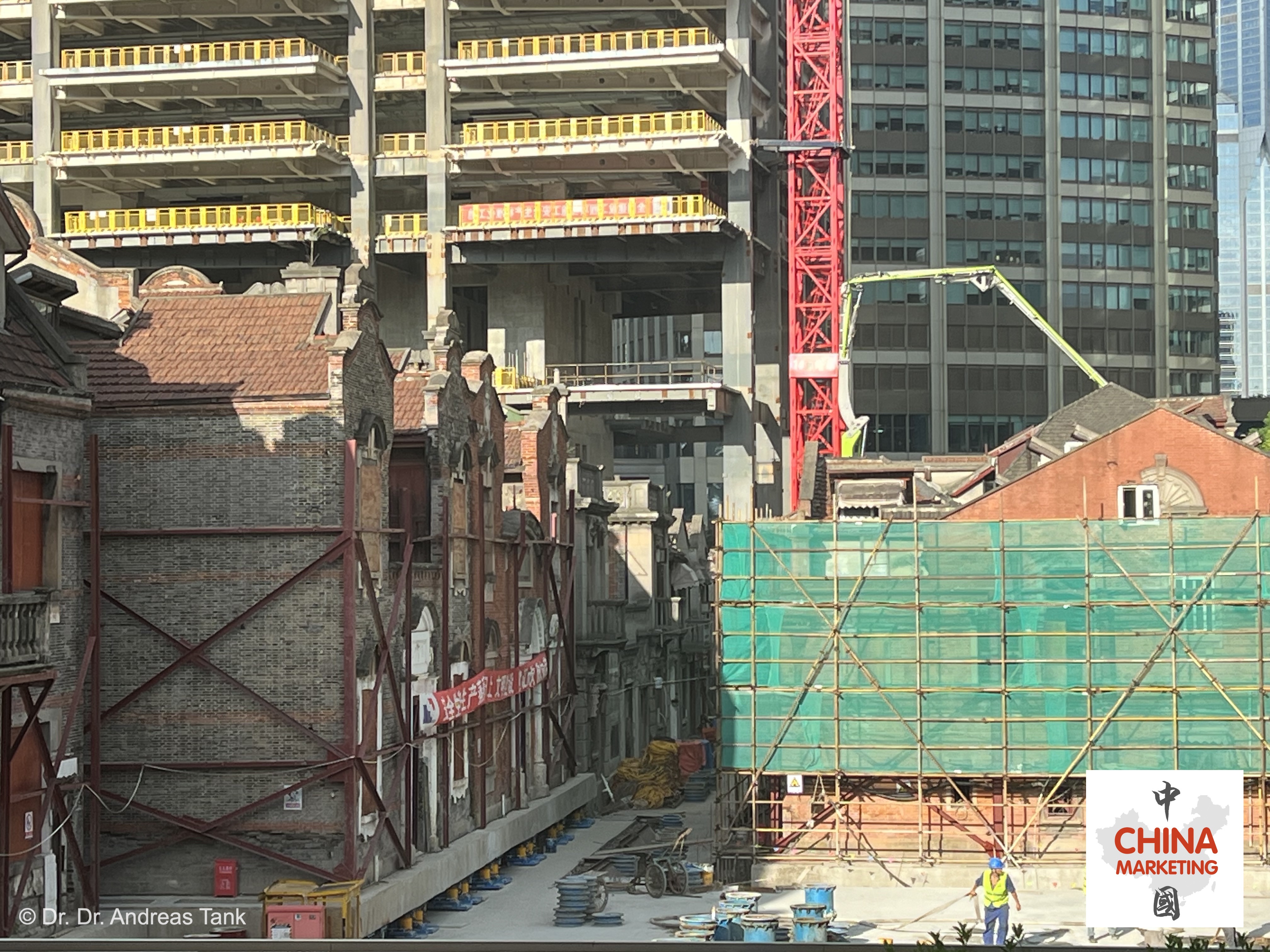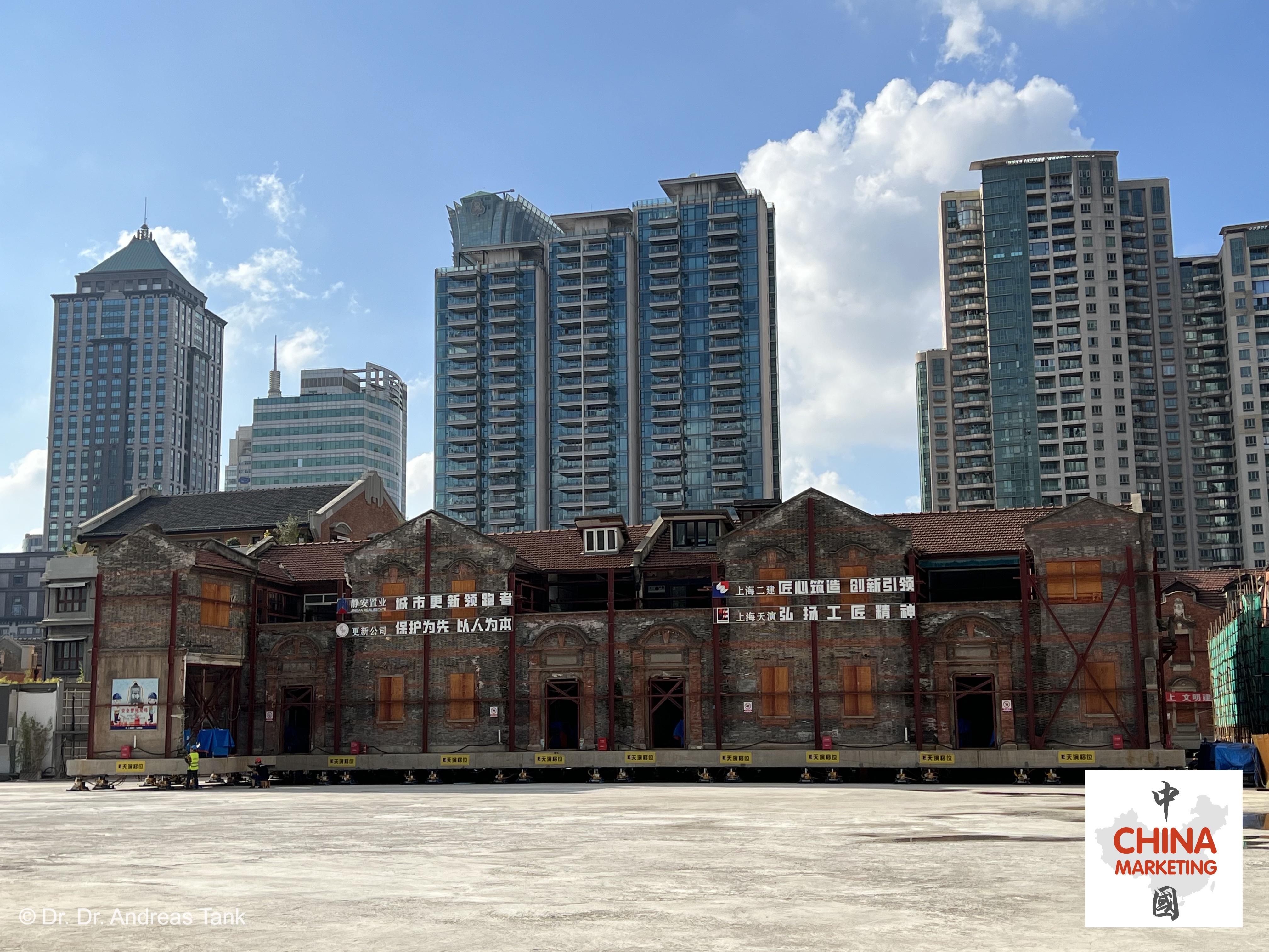 In die Restaurierung von Shanghais Zhangyuan kommt buchstäblich Bewegung. Während der westliche Teil bereits im November 2023 eröffnet wurde, befindet sich der östliche Teil, in dem 26 historische Gebäude erhalten werden, noch in der Entwicklung: hydraulische „Füße“ versetzen die alten Häuser an ihren künftigen Standort.