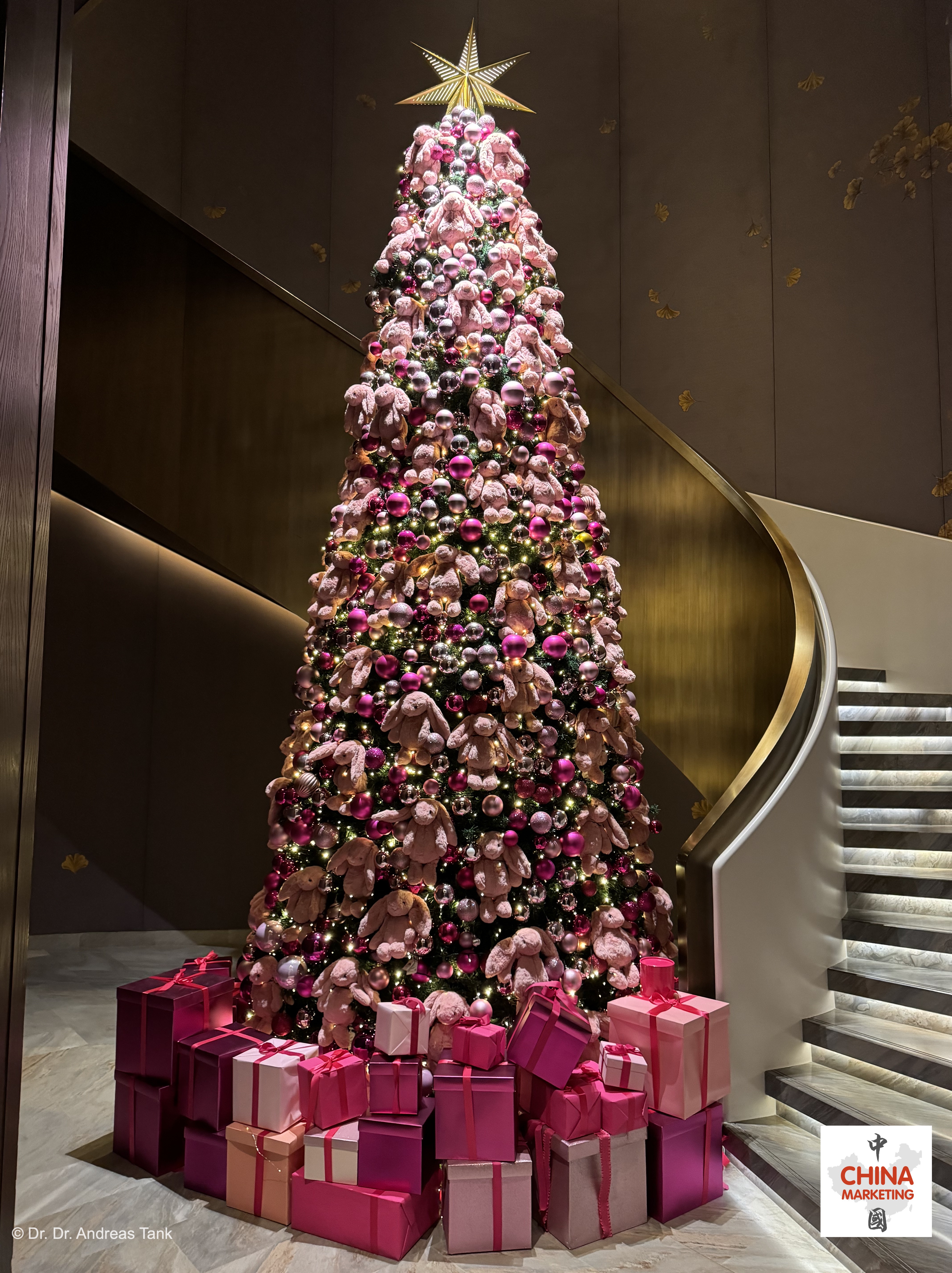 Weihnachtsbäume eignen sich hervorragend für Markenkooperationen. Die Bäume in den Peninsula Hotels in Peking und Shanghai sind mit Markenelementen von Chanel geschmückt, das Waldorf Astoria Shanghai on the Bund hat einen La Mer-Weihnachtsbaum in der historischen Lobby und das Schwesterhotel in Peking zieht zahlreiche Besucher mit einem Jellycat-Baum an, an dem unzählige rosafarbige Hasen hängen. Ebenso rosa ist der Valentino-Baum bei Harrods in Shanghai. Zu guter Letzt hat Kimpton Qiantan einen Baum aus Voss-Wasserflaschen konstruiert. Welche Marke wählen Sie für Ihren Christbaumschmuck? at
