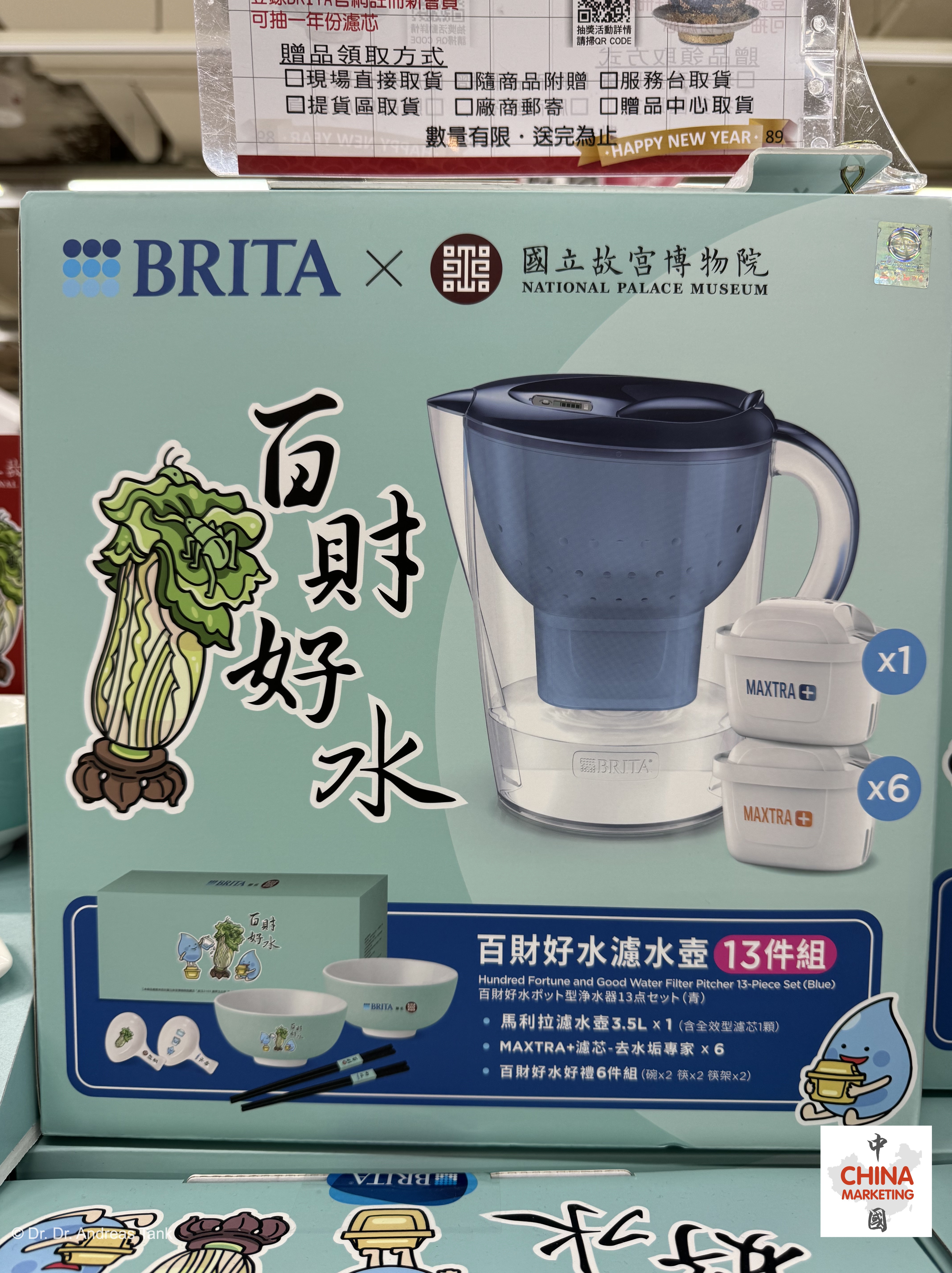 BRITA Taiwan kooperiert mit dem Nationalen Palastmuseum in Taipei und verkauft einen limitierten „Hundred Fortune and Good Water Filter Pitcher“. Das 13-teilige Set besteht aus speziell gestalteten Reisschüsseln, Essstäbchen und Essstäbchenhaltern, auf denen der berühmte Jadekohl zu sehen ist – eines der vielen Meisterwerke der Museumssammlung, das bei Besuchern großen Ruhm erlangt hat. Der Name der Sonderausgabe ist höchst passend gewählt: 百财 (bai cai, hundert Reichtümer) ist homophon mit白菜 (bai cai, Kohl) und 好水 (hao shui) bedeutet nicht nur „gutes Wasser“, sondern auch „schön“. at