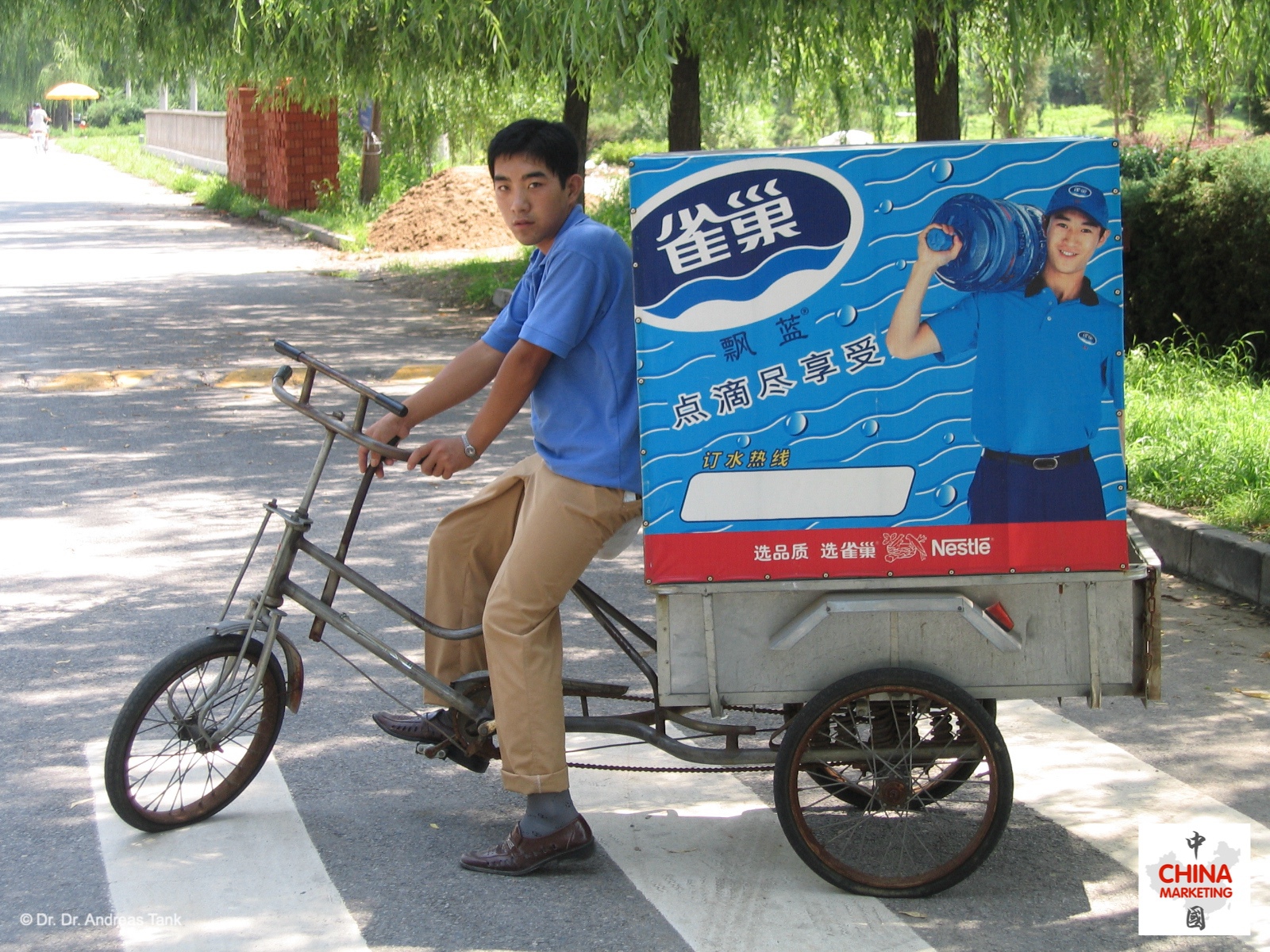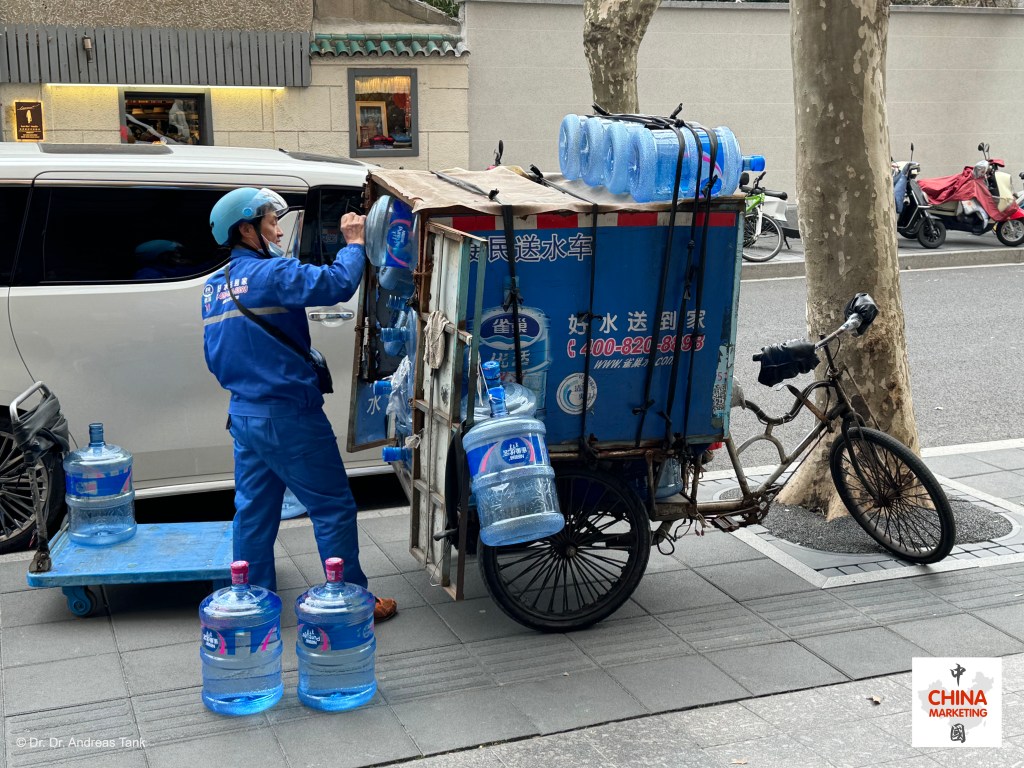 Déjà-vu! Kaum zu glauben, aber zwischen diesen beiden Fotos liegen 20 Jahre … Eines wurde 2004 in Peking aufgenommen, eines kürzlich in Shanghai. Es ist erfrischend zu sehen, dass sich in China nicht alles ändert und Nestlé immer noch auf die gleichen Dreiräder – 便民送水车 – für die Feinverteilung setzt. Pure Life Wasser direkt an die Haustür geliefert: 好水送到家! at