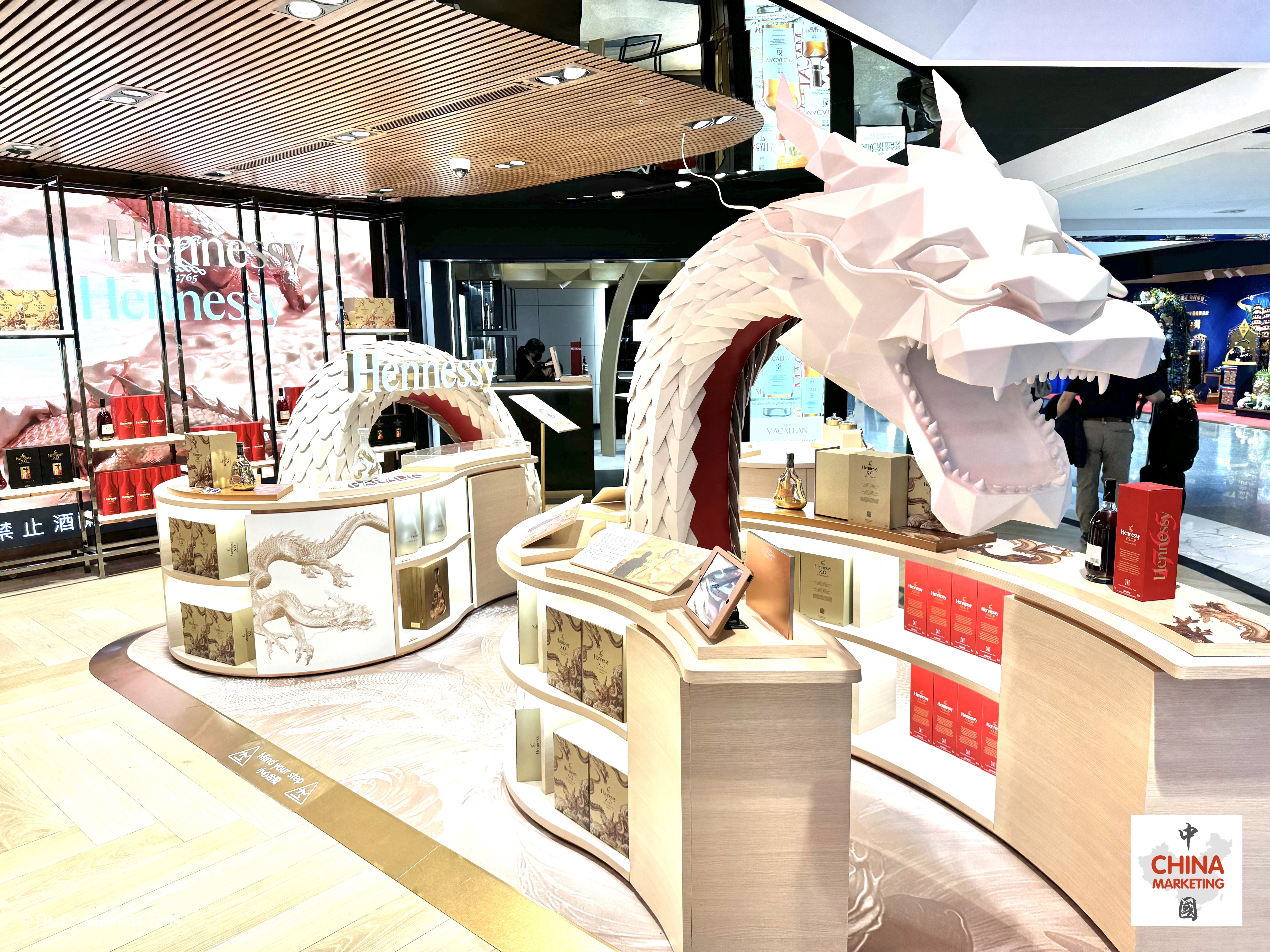Ein weiteres beeindruckendes Drachenjahrdisplay am Flughafen Taoyuan in Taipeh stammt von Hennessy. Die Sonderedition zeigt viel Liebe zum Detail: Zum Beispiel eine handgefertigte Bernardaud-Porzellankaraffe mit leuchtend goldenen Drachenmotiven, präsentiert in einer Eichenkiste, oder eine exklusive Cognacflasche „gekleidet in Gold“ – entworfen vom zeitgenössischen chinesischen Künstler Yang Yongliang (杨泳梁).