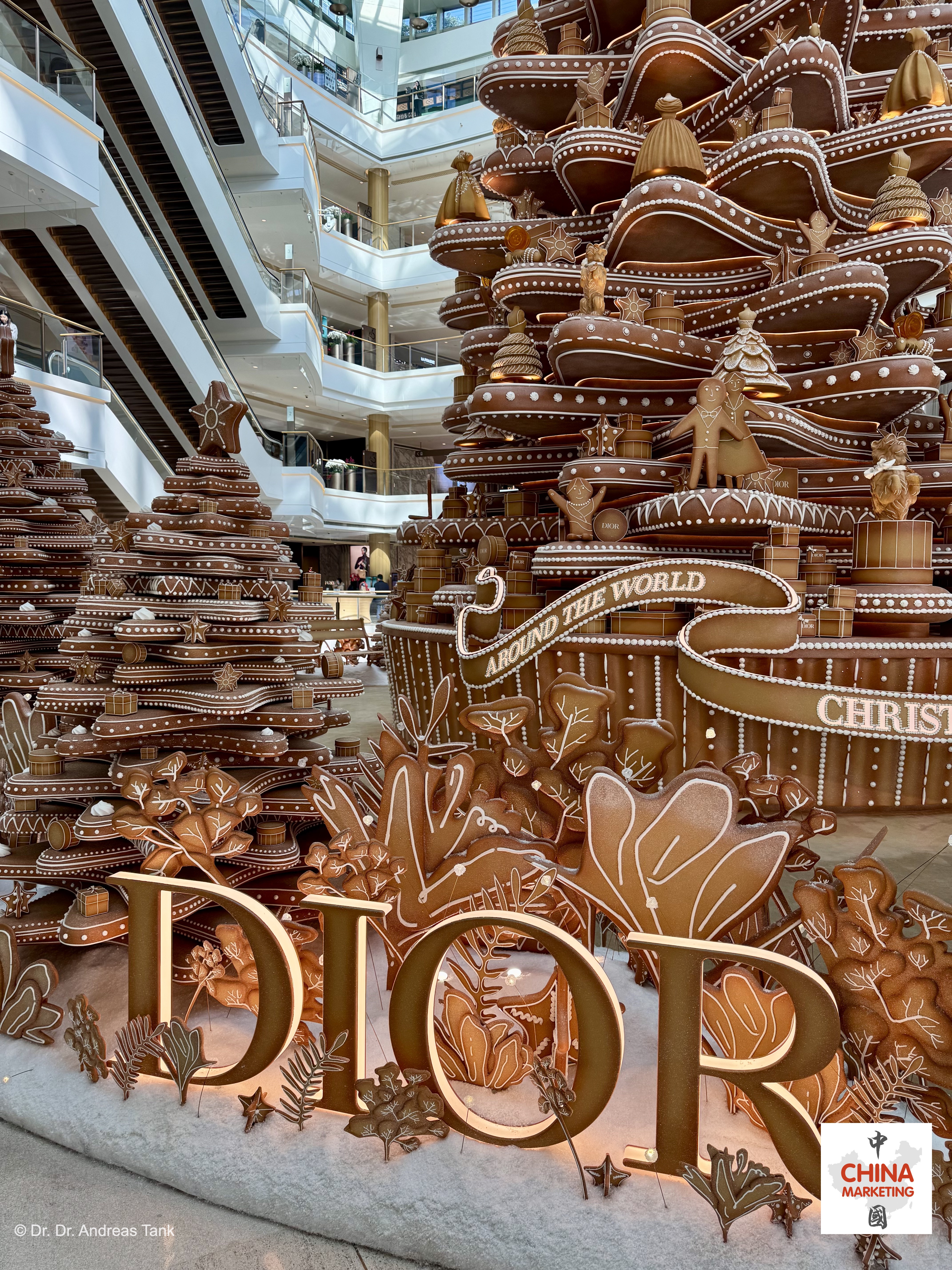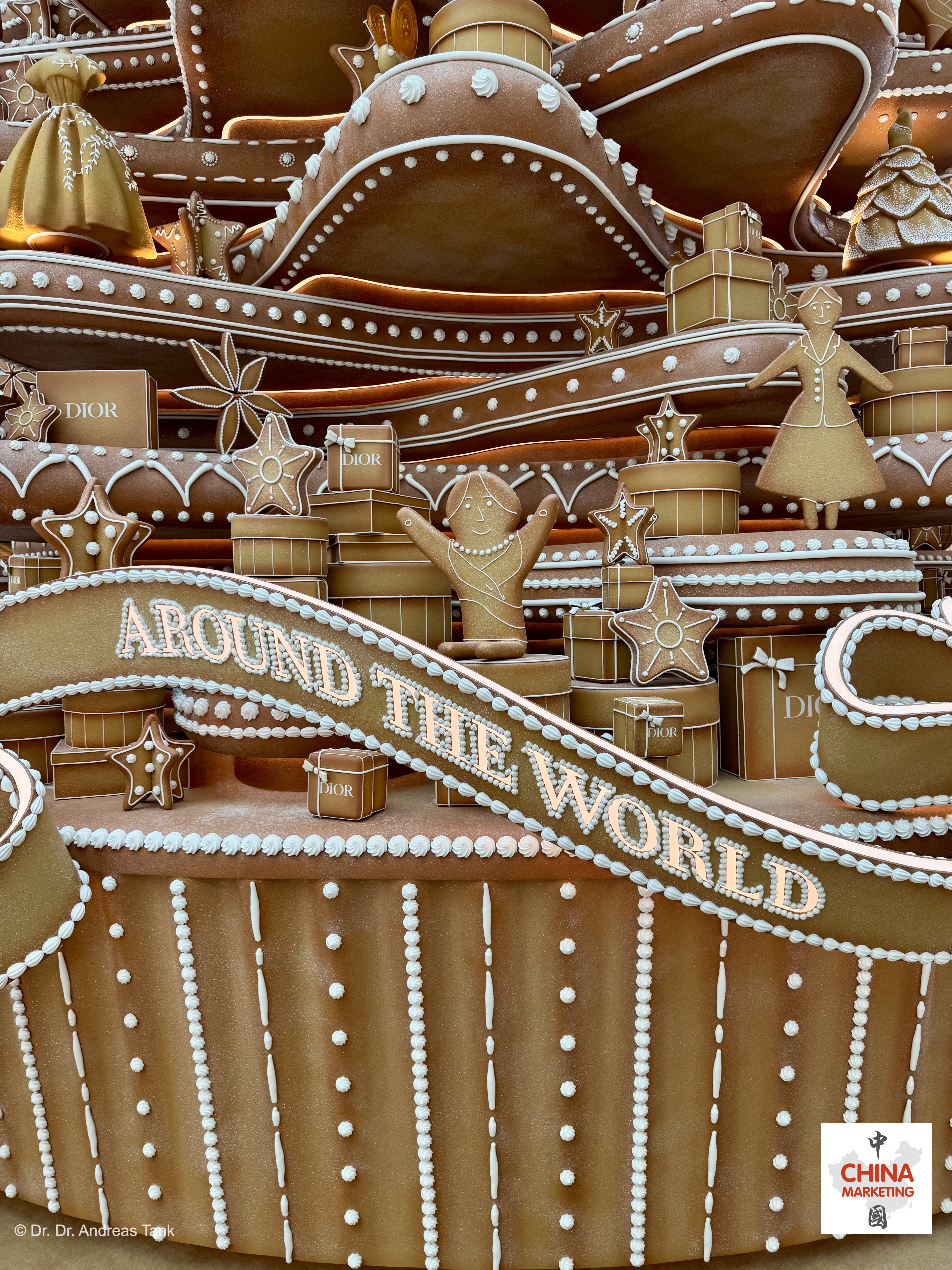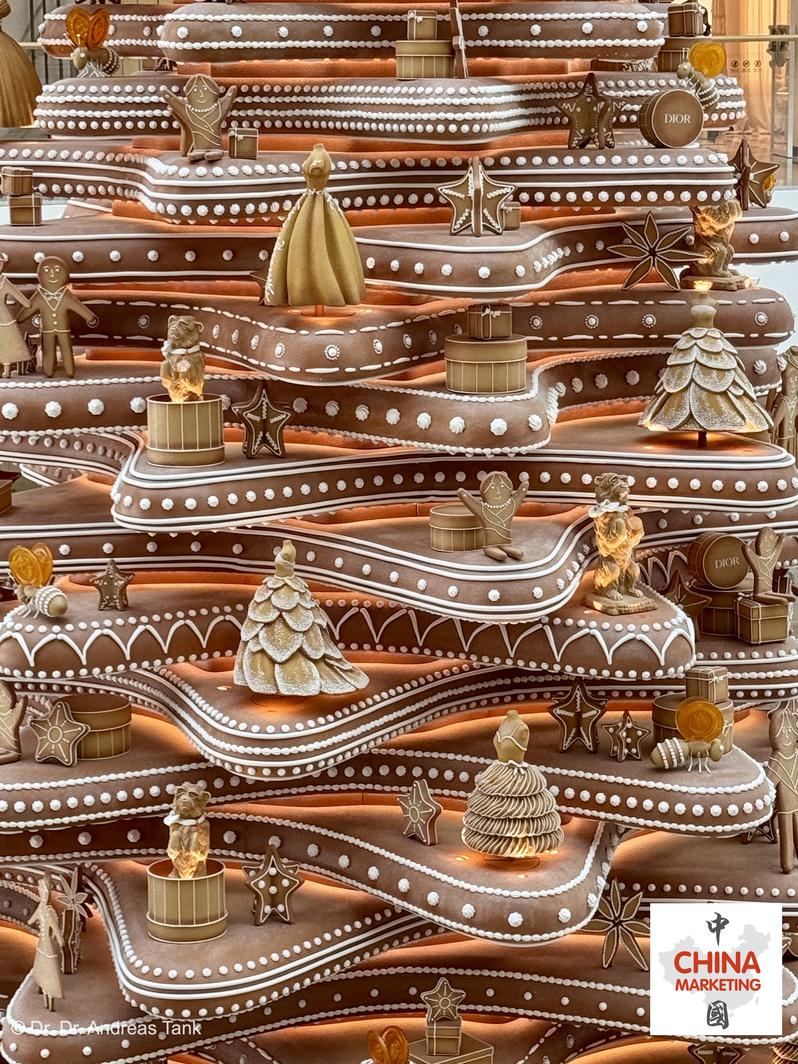 Einer der spektakulärsten Weihnachtsbäume in Shanghai steht dieses Jahr im Luxus-Einkaufszentrum Plaza 66. Die über 10 Meter hohe monumentale Kiefer wurde von Lebkuchenhäusern inspiriert. Sie ist mit einer „Christian Dior Around The World“-Schleife geschmückt und mit bezaubernden, sich drehenden Details verziert: klassische Dior-Designs wie das Junon-Kleid, das Tourbillon-Modell und der legendären Bar-Anzug. Aufmerksame Besucher entdecken auch Christian Diors Hund Bobby. Der Baum ist von Lebkuchenbänken umgeben und ein Lebkuchenmann macht Fotos mit einer Lebkuchenkamera. Für Dior, dessen Shanghaier Flaggschiffgeschäft sich in der Plaza 66 befindet, ist der bezaubernde Baum eine Hommage an Träume, die fabelhafte Momente voller Emotionen versprechen. at