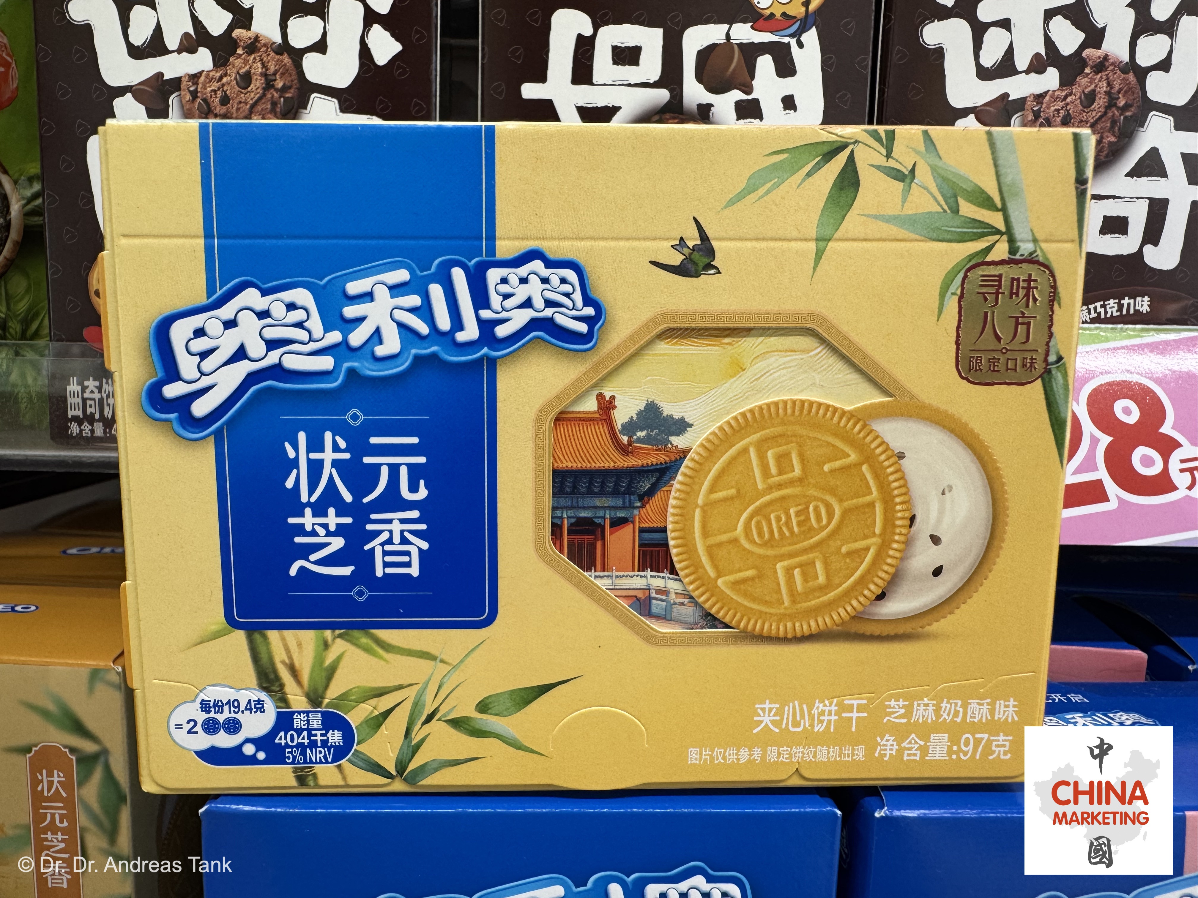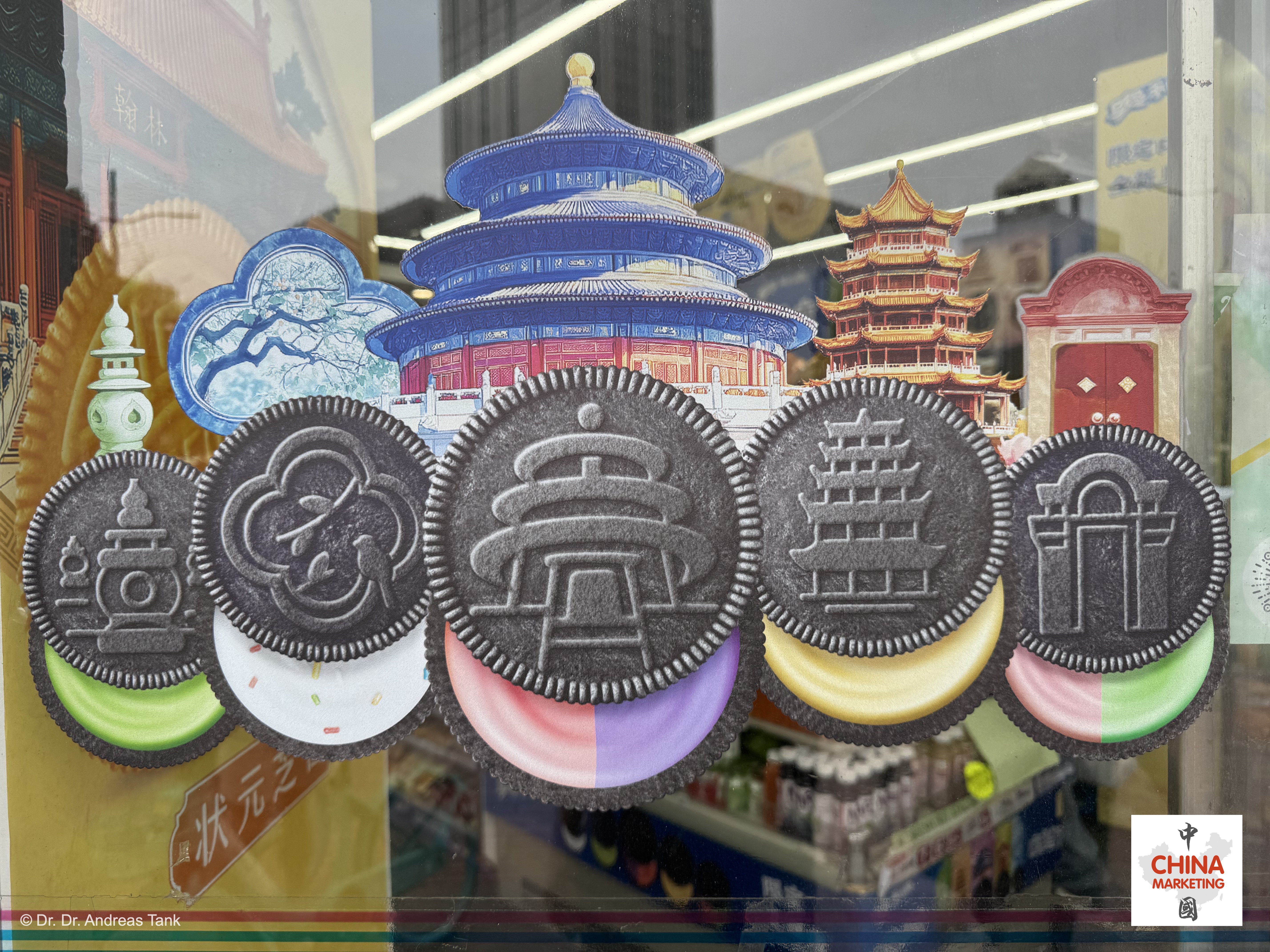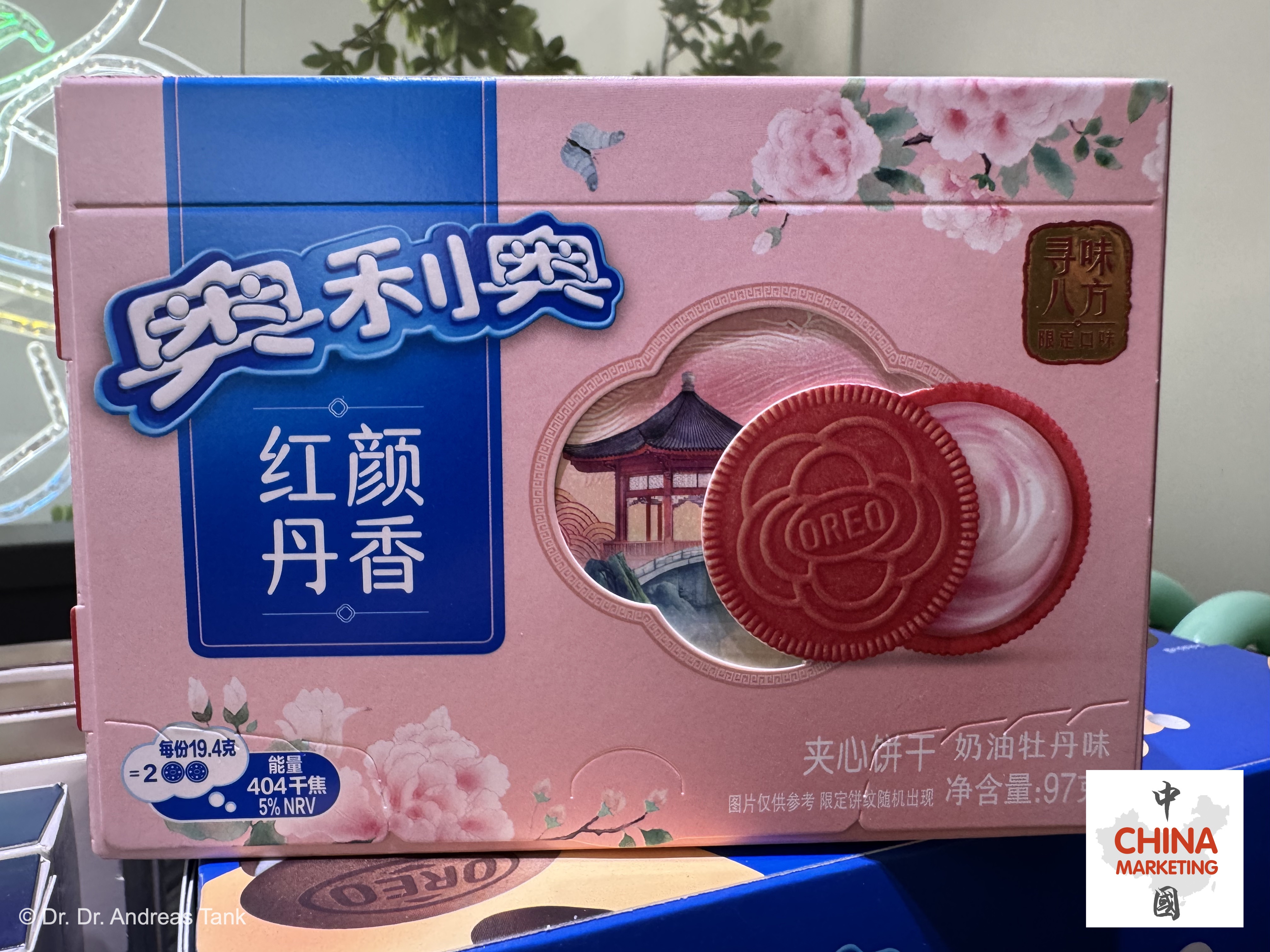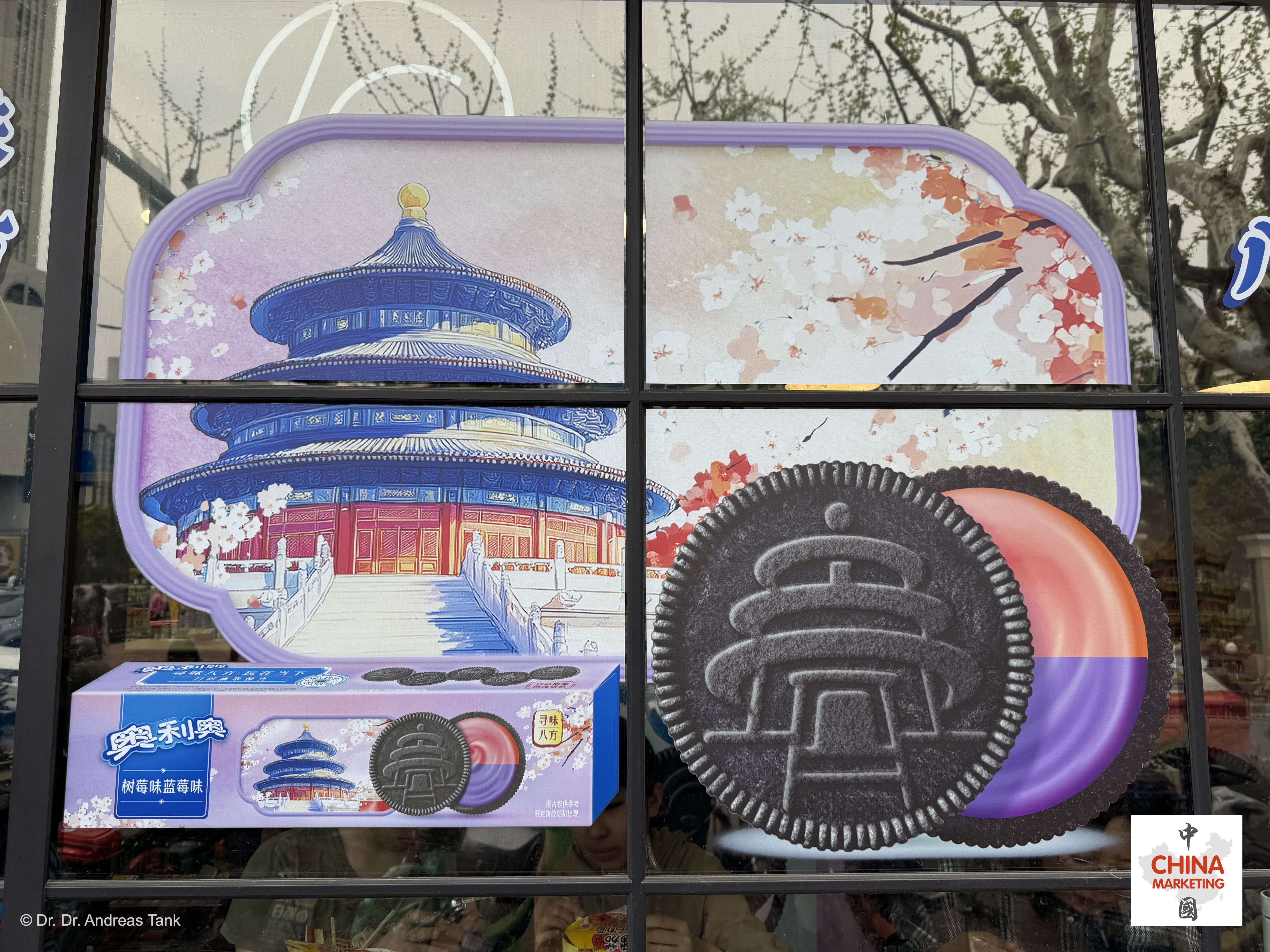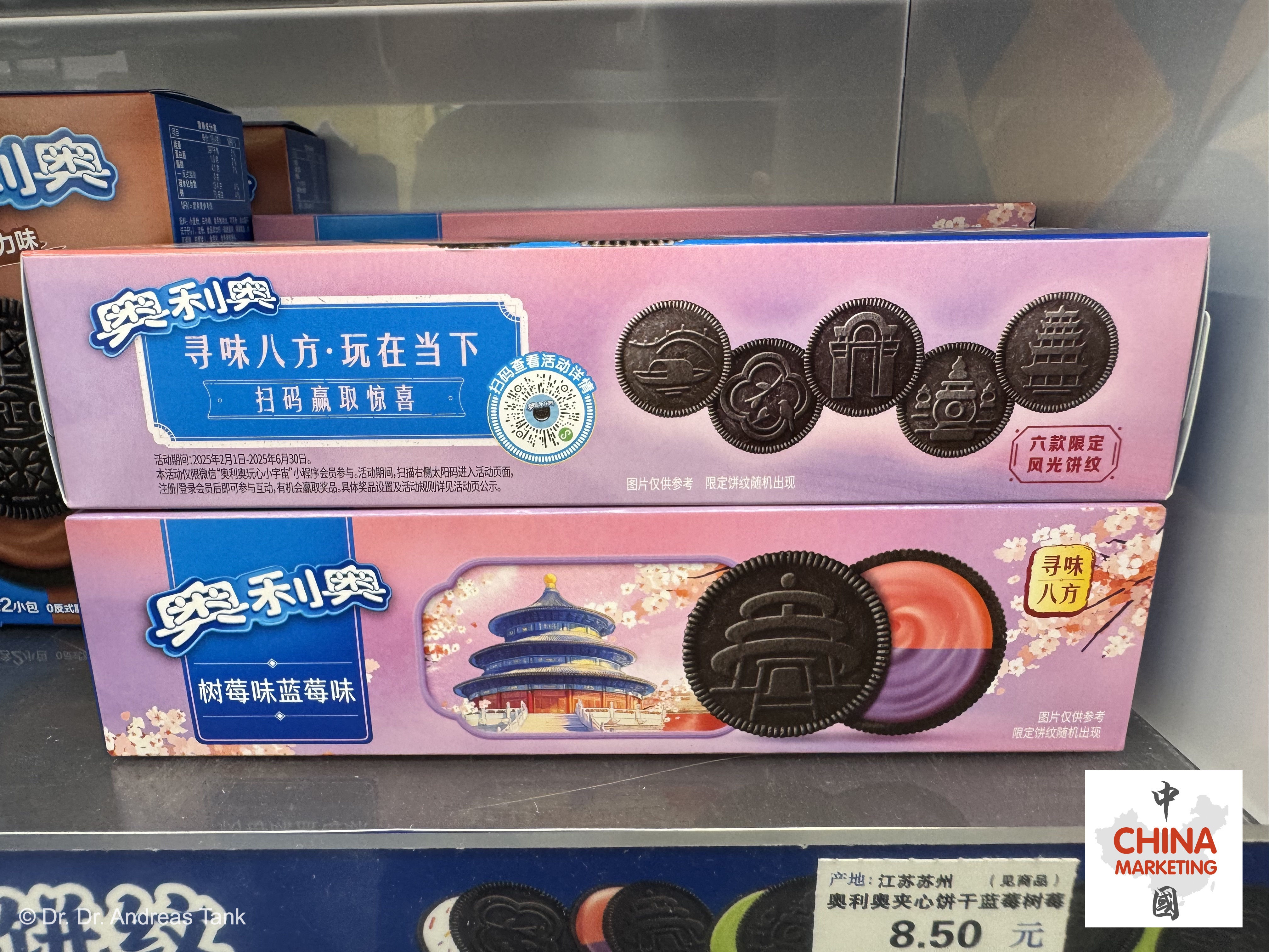 Oreo hat in China fünf limitierte Kekse mit Landschaftsmuster auf den Markt gebracht. Jedes Design ist an ikonische Orte mit starkem kulturellem Erbe angelehnt: den Himmelstempel in Peking (Himbeere-Blaubeere), die Kranichpagode in Wuhan (Pfirsich-Oolong-Tee), die berühmten Gärten in Suzhou (Geburtstagskuchen-Geschmack), eine Steinlaterne vom malerischen Westsee in Hangzhou (Matcha-Eis) und einen Eingang zu Shanghais einzigartigen Shikumen-Steintorhäusern (Pfirsich-Traube).